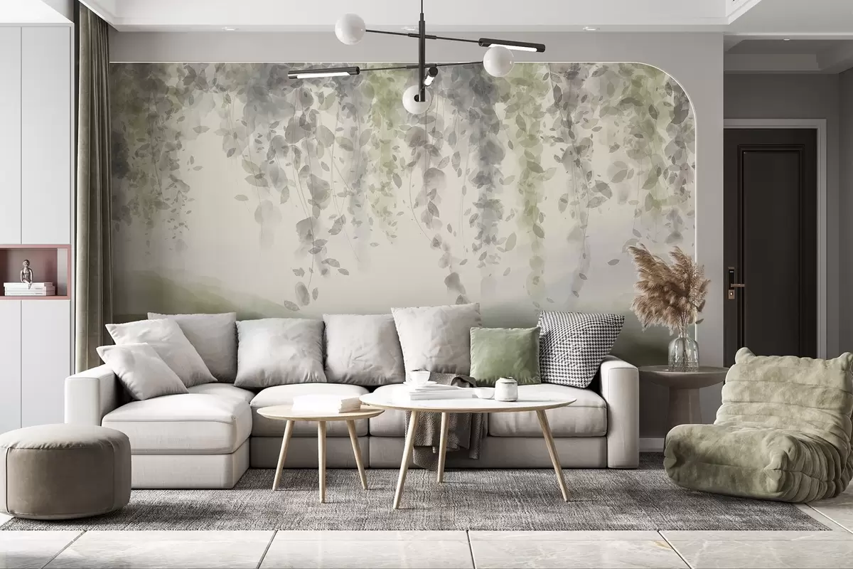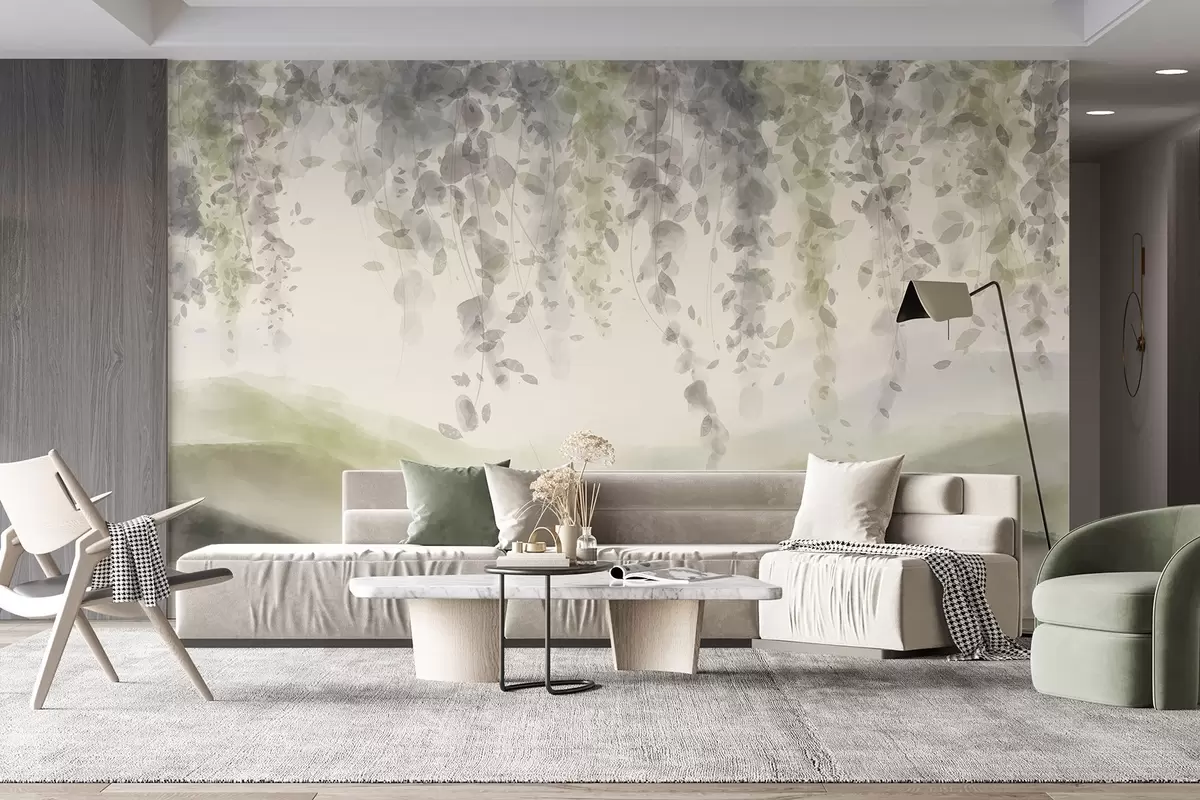 Тапете за зид Листови глициније виси преко замућених планина, меке пастелне зелене и беж боје, пејзаж у стилу акварела бр. w08909v2