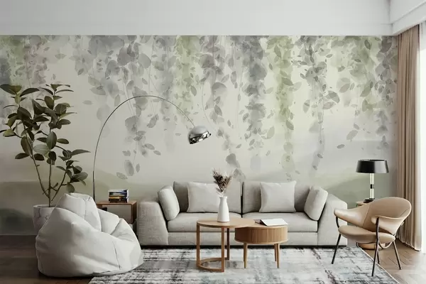 Тапете за зид Листови глициније виси преко замућених планина, меке пастелне зелене и беж боје, пејзаж у стилу акварела бр. w08909v2