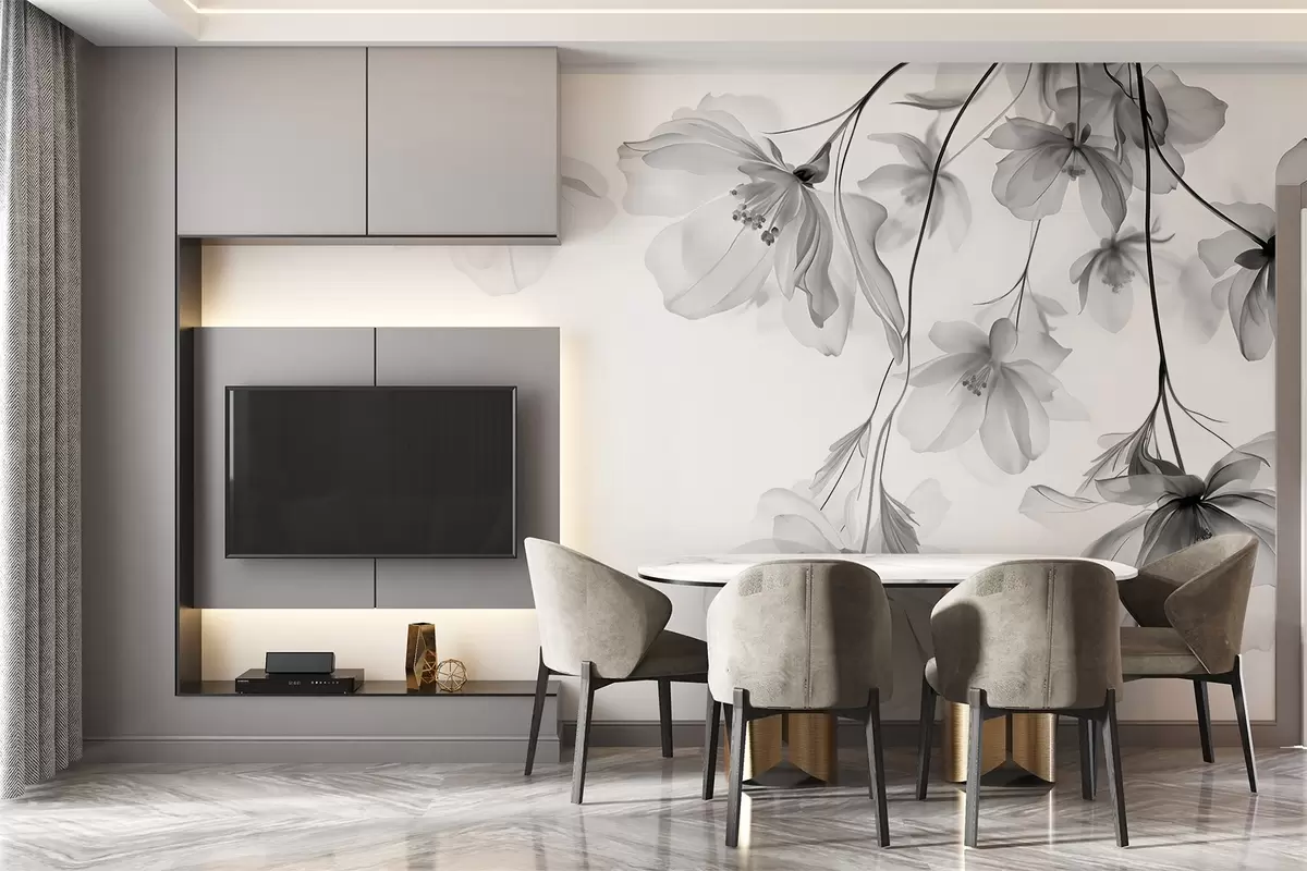 Тапете за зид Црно цвеће са провидним латицама које висе са гране, црно-бело, минималистичка модерна уметничка композиција бр. w08911