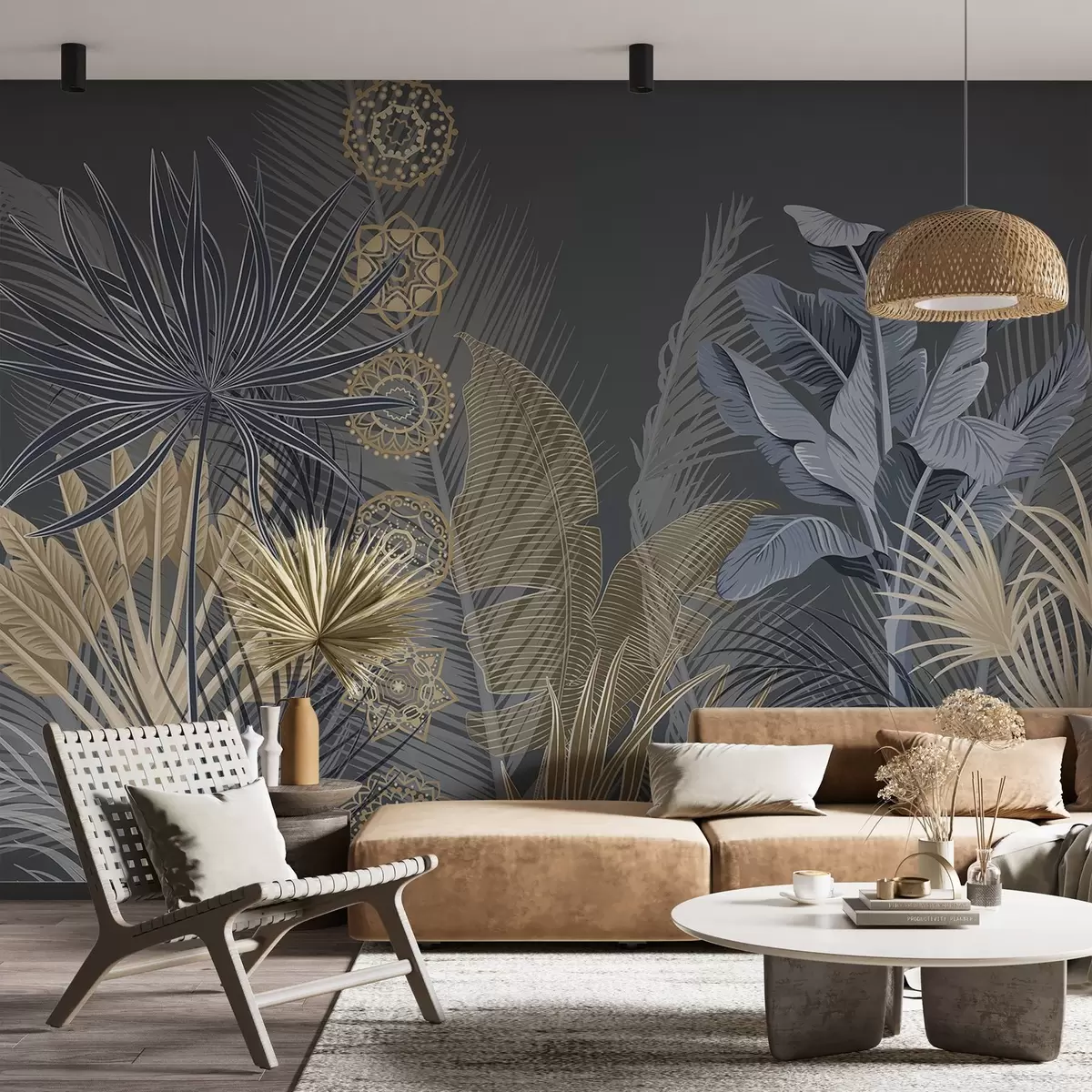 Тапете за зид Тропско лишће у плавим и смеђим тоновима, палмино лишће, лишће банане и украси од мандала, тамна позадина бр. w08913
