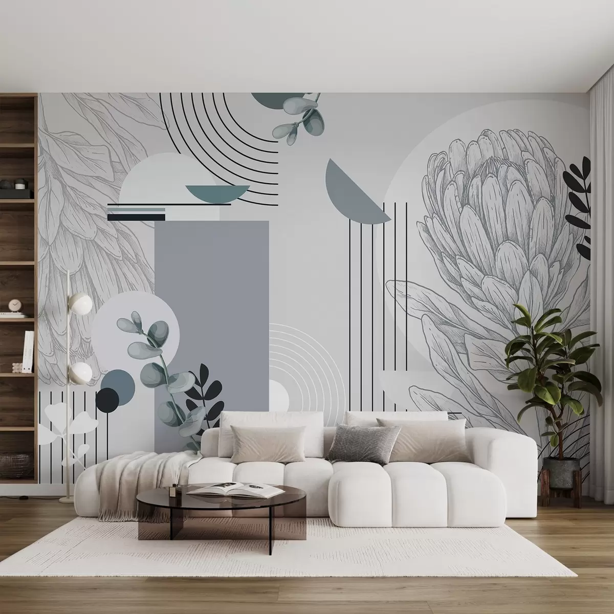 Тапете за зид Апстрактни ботанички принт са цветом протеа, листовима еукалиптуса, геометријским облицима у минималистичком стилу, пастелним бојама бр. w08914v1