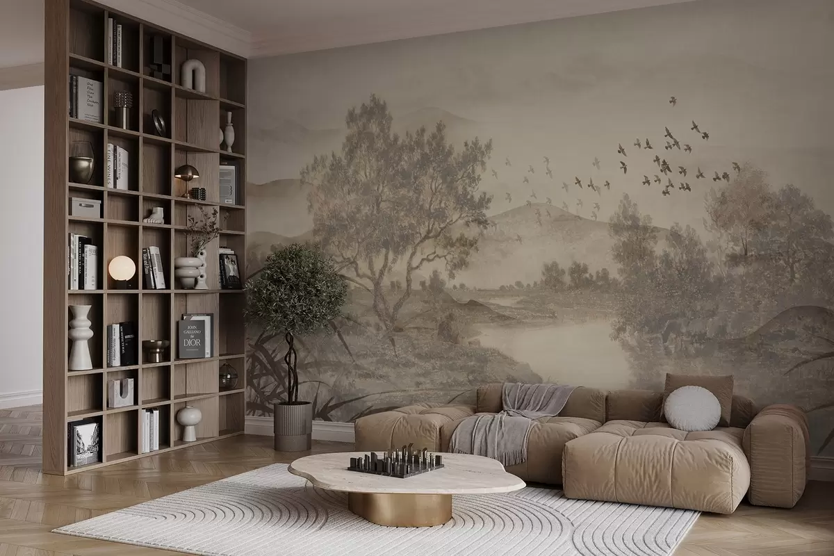 Тапете за зид Текстурирани старински пејзаж са дрветом у близини реке и облачним небом, природна уметност у тоновима сепије бр. w08920