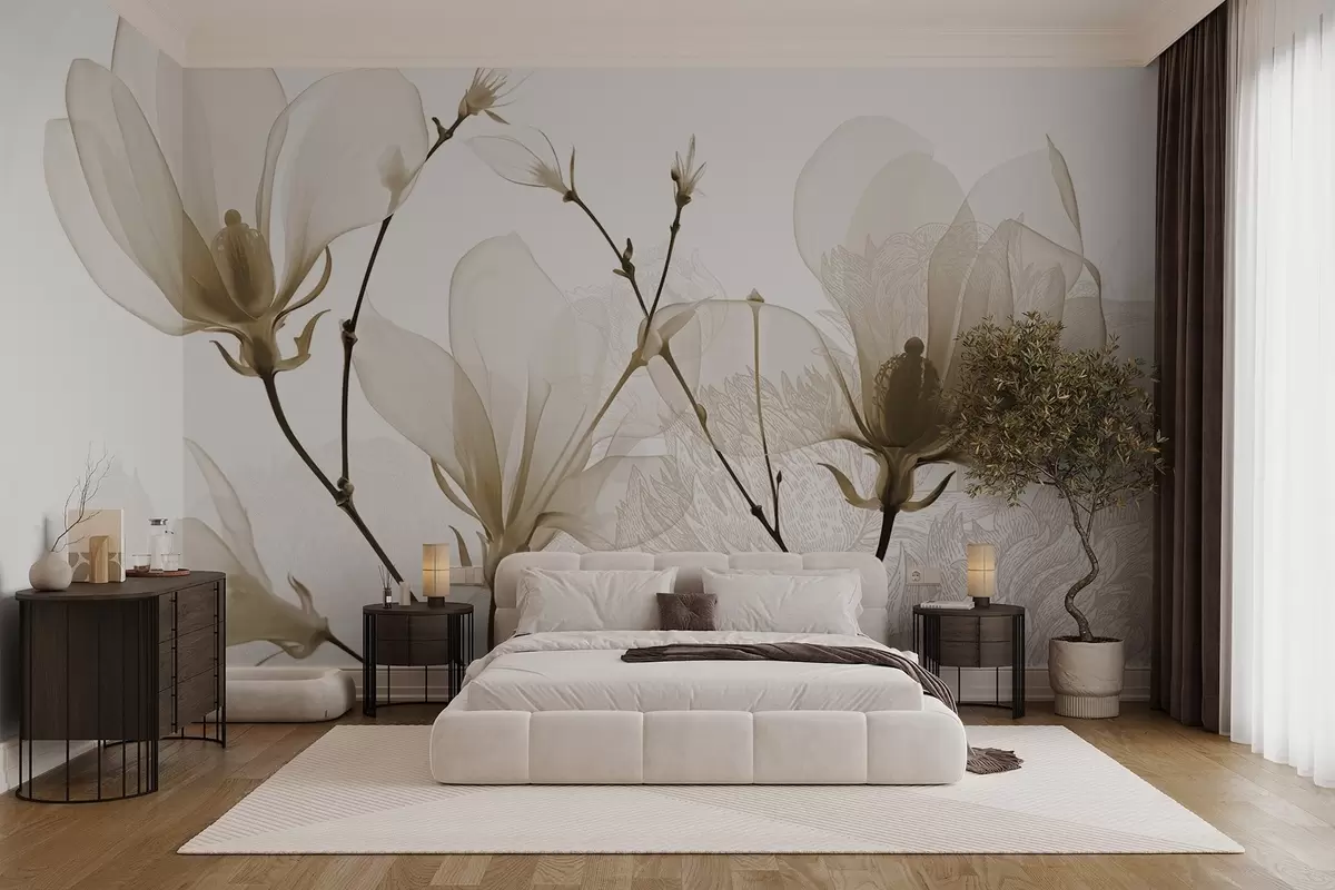 Тапете за зид Провидно беж цвеће магнолије са силуетама цвећа са деликатним латицама и тамним стабљикама бр. w08978v1