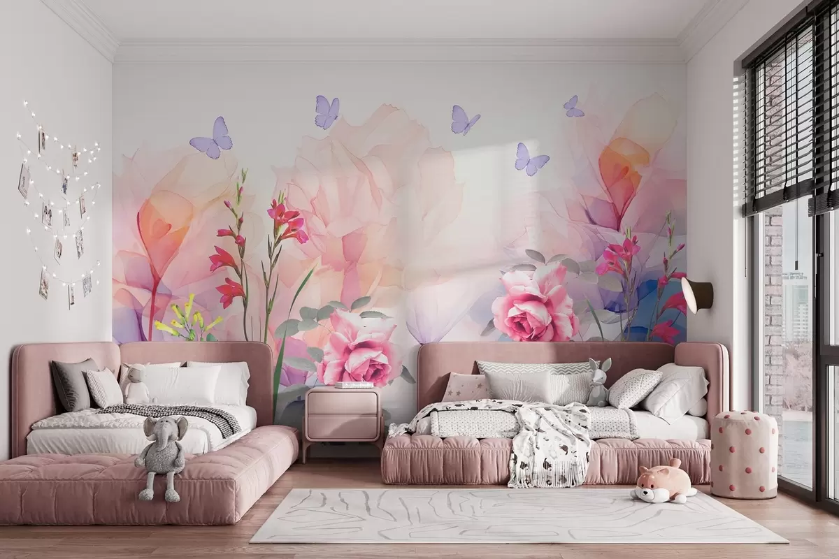 Тапете за зид Цвеће са лептирима и ружама у стилу акварела бр. w09002