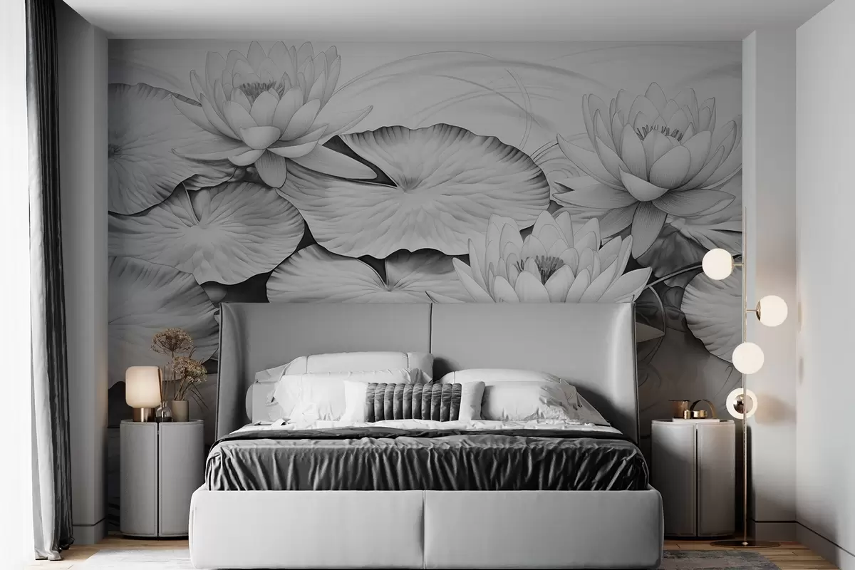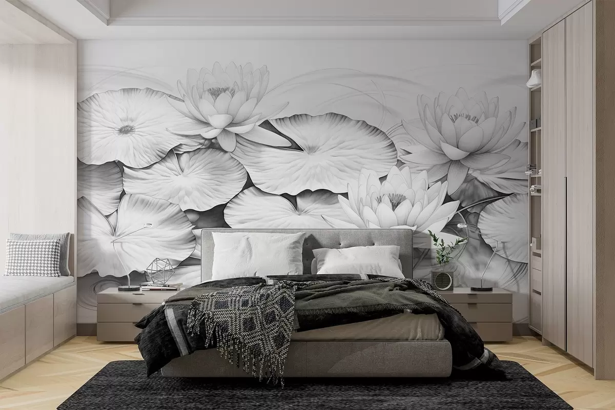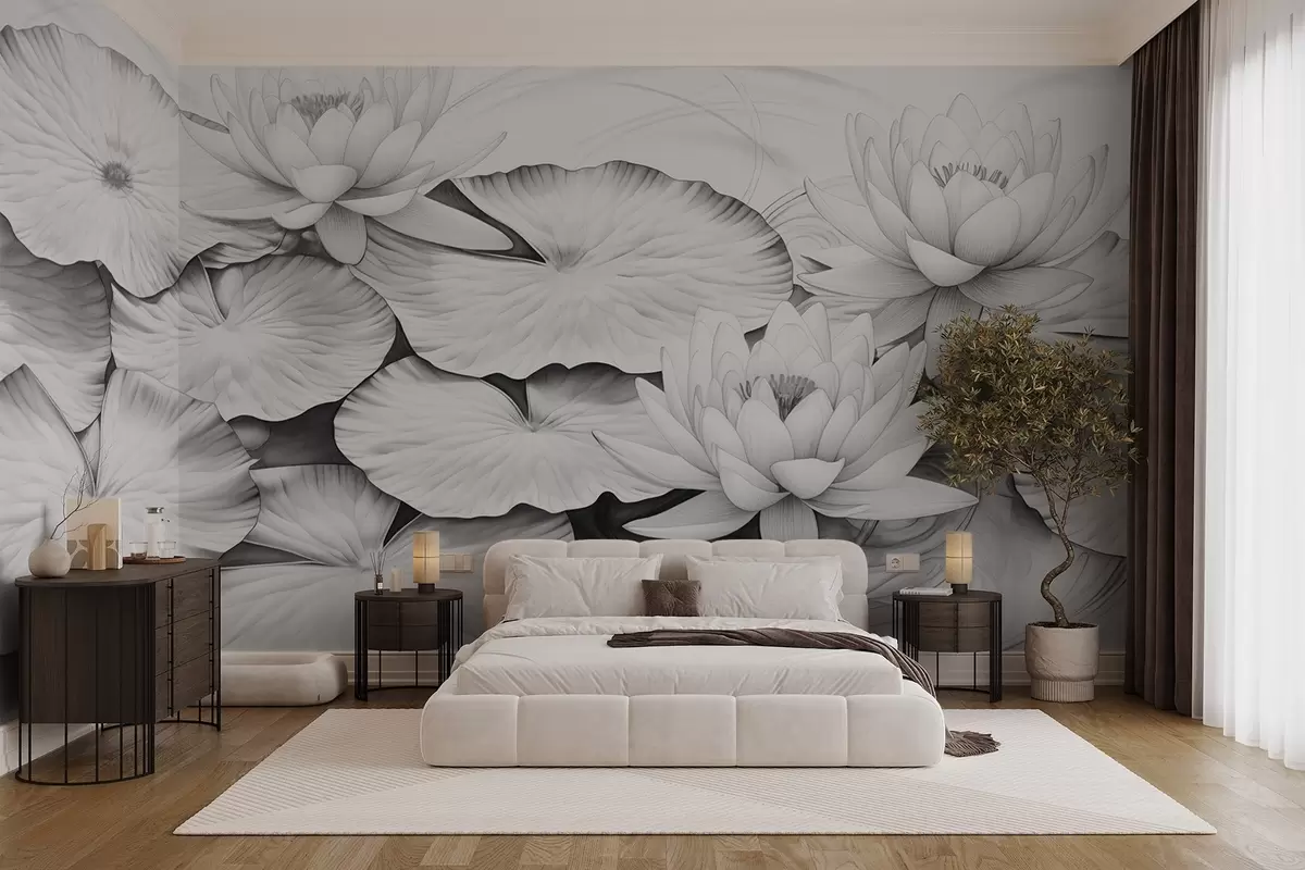 Тапете за зид Локвањи и јастучићи љиљана у рибњаку, црно-бела имитација цртежа оловком, детаљна ботаничка илустрација, уметност природе бр. w09006