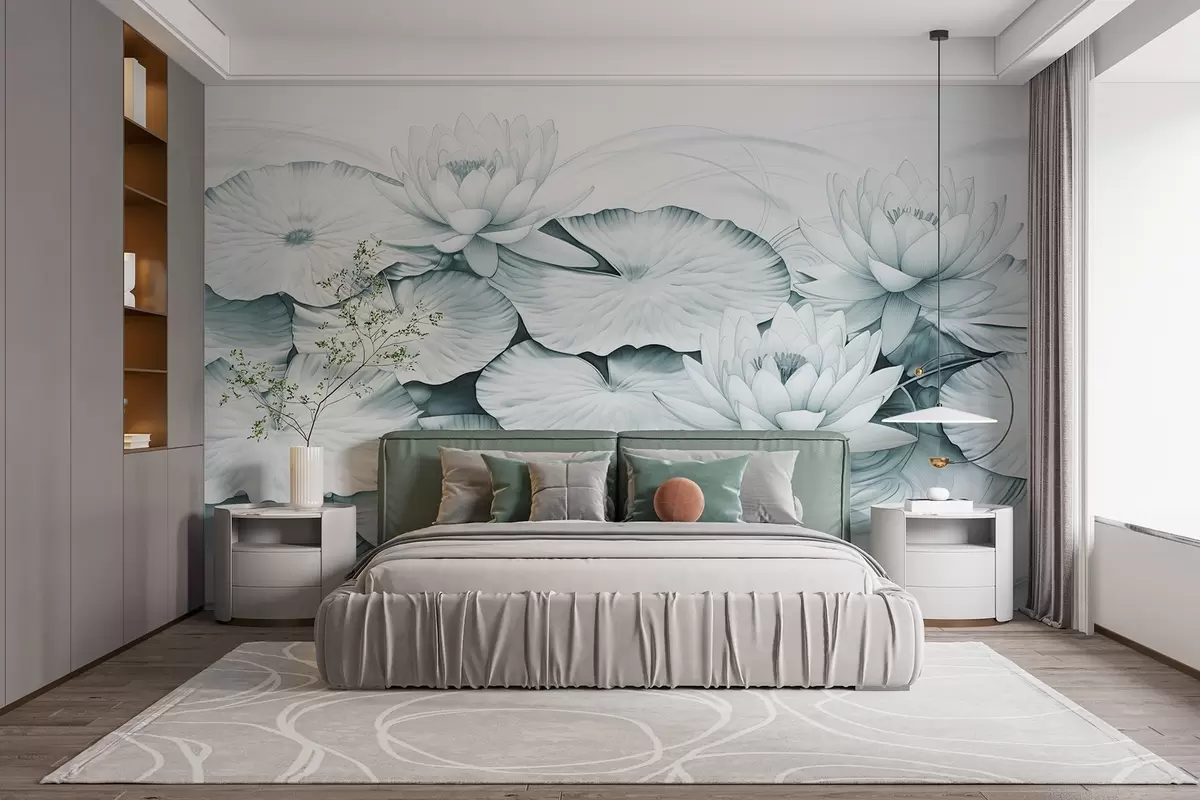 Тапете за зид Локвањи и јастучићи љиљана у рибњаку, тиркизна и бела имитација цртежа оловком, детаљна ботаничка илустрација, уметност природе бр. w09006v1