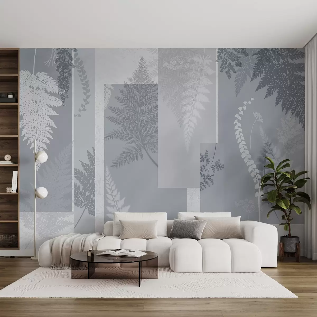 wall murals Листови папрати у плавој и белој боји, поређани у вертикалне пруге, стварајући ботанички и минималистички принт, меких и пригушених боја w09007v1