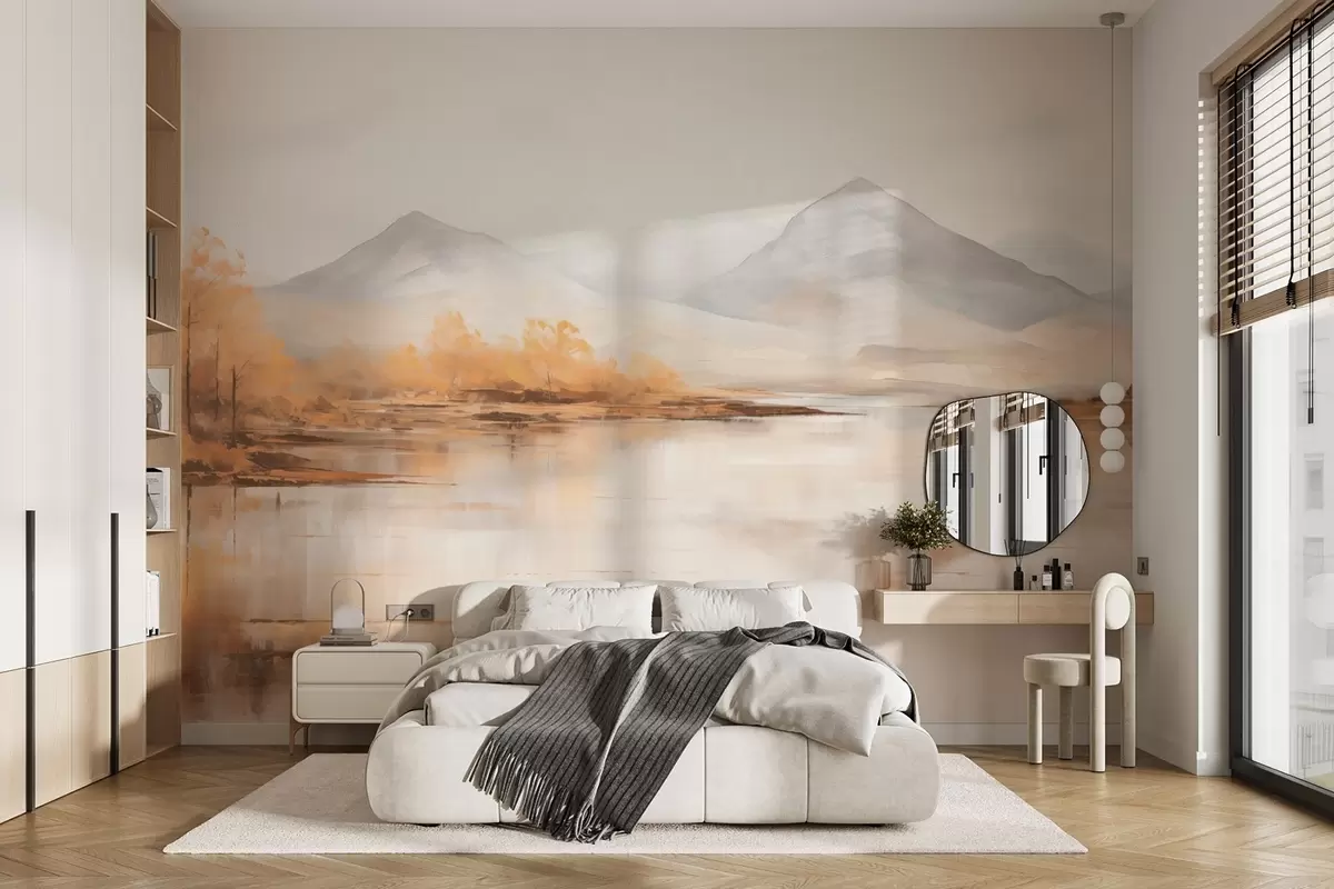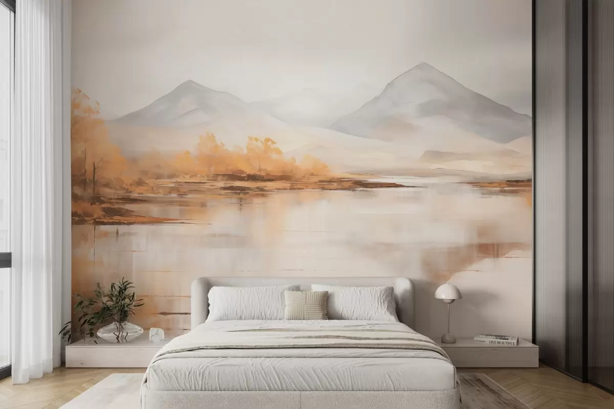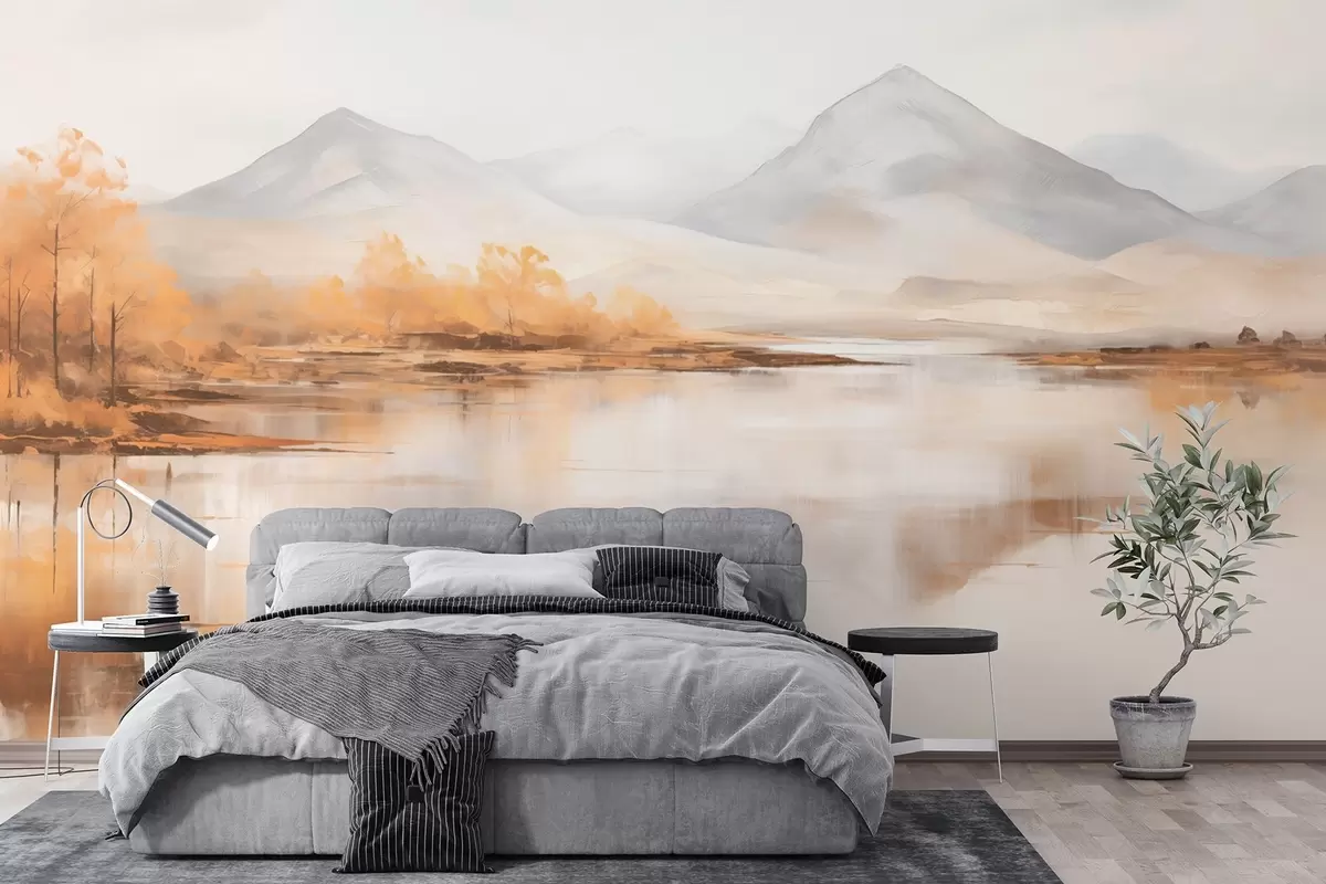 Тапете за зид Јесењи пејзаж са жутим дрвећем и реком на планинској позадини бр. w09020