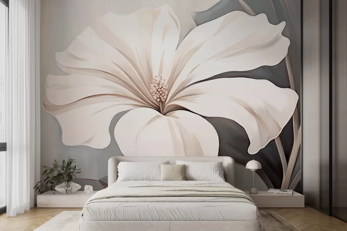 Тапете за зид Велики бели цвет са латицама на плаво-сивој позадини бр. w09033