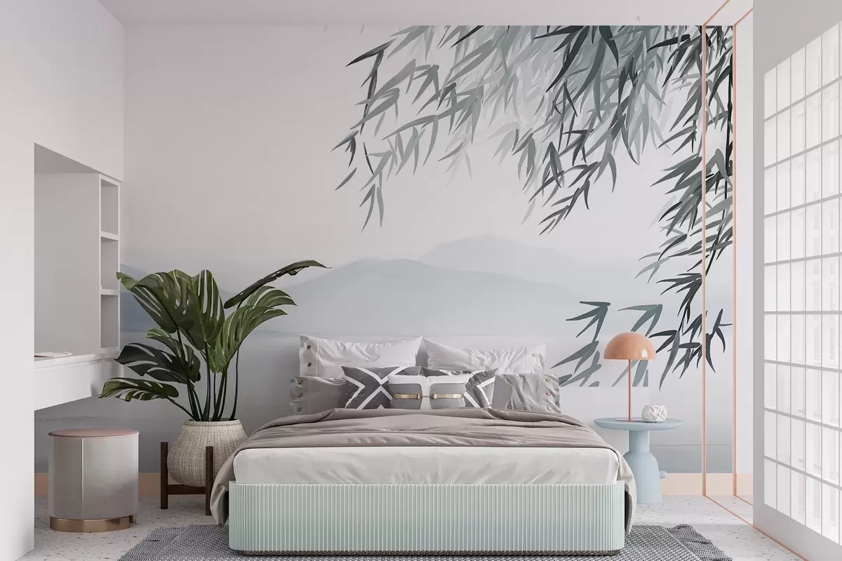 Тапете за зид Бамбусово лишће виси изнад језера са планинама у позадини, нежни плави и бели тонови, стил сликања тушем бр. w09048