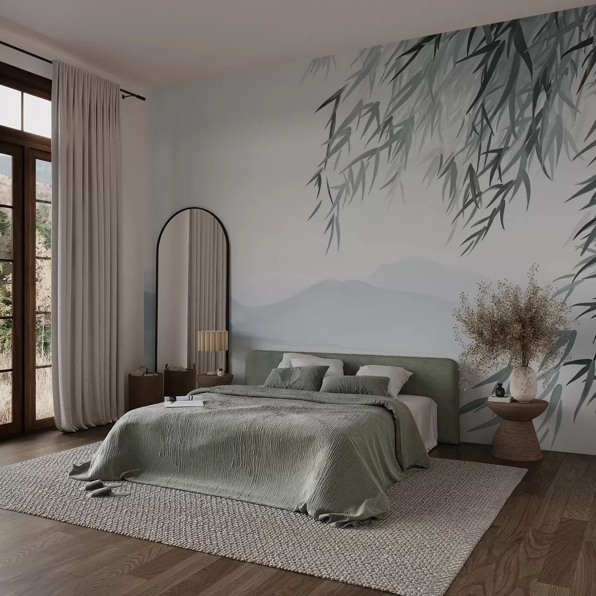 Тапете за зид Бамбусово лишће виси изнад језера са планинама у позадини, нежни плави и бели тонови, стил сликања тушем бр. w09048