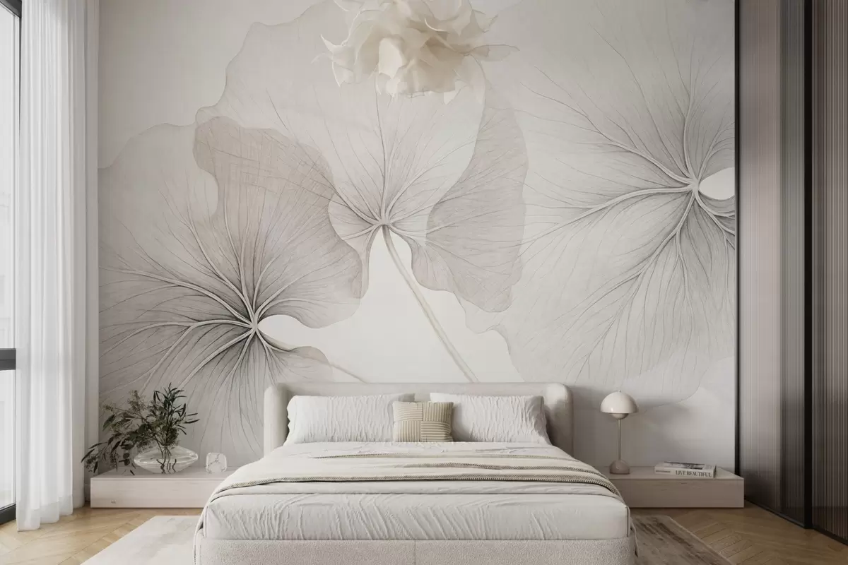 Тапете за зид Три провидна листа са видљивим венама, са текстуром буке која се благо преклапа, са танким стабљикама на белој позадини бр. w09052