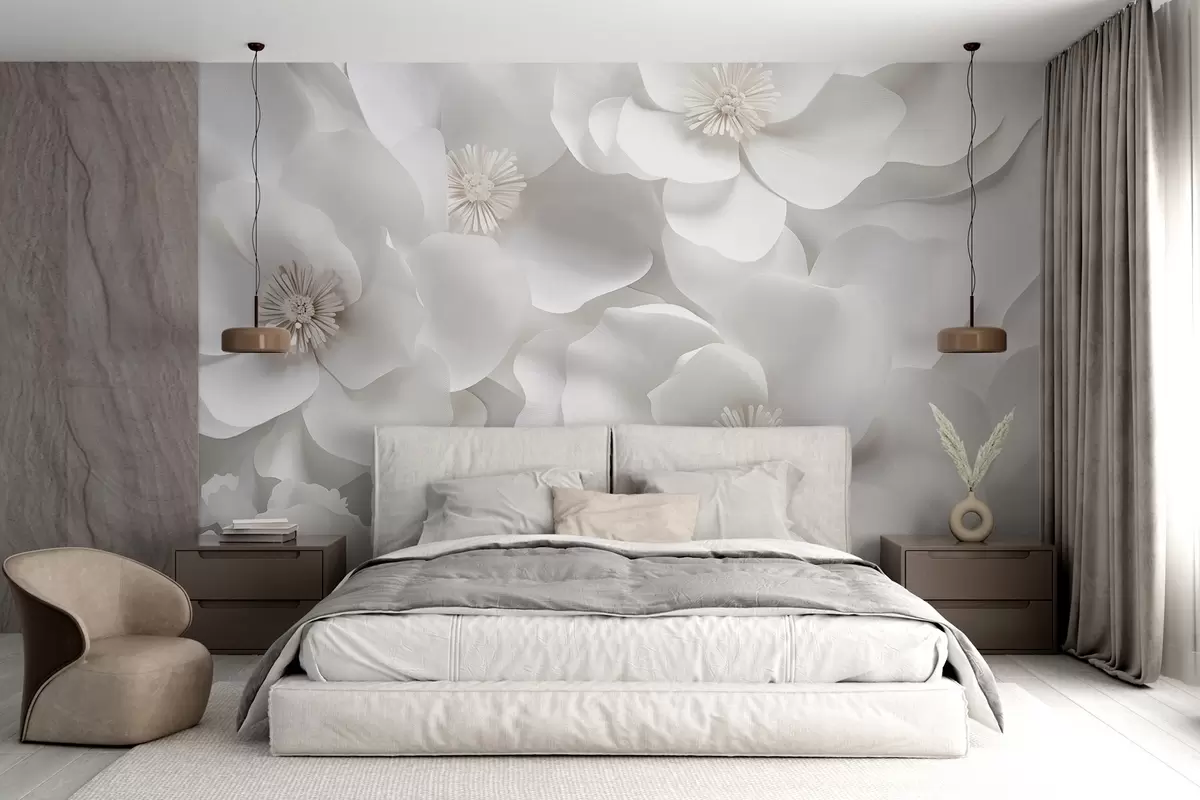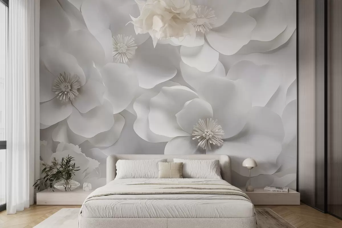 Тапете за зид Бели цветови са деликатним латицама, распоређени у густу грозд, стварају осећај чистоће и елеганције на белој позадини бр. w09053