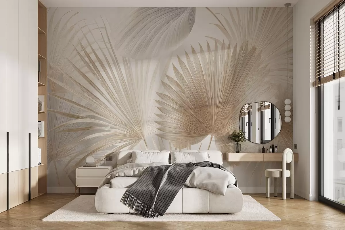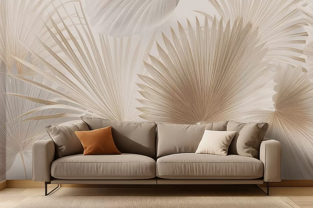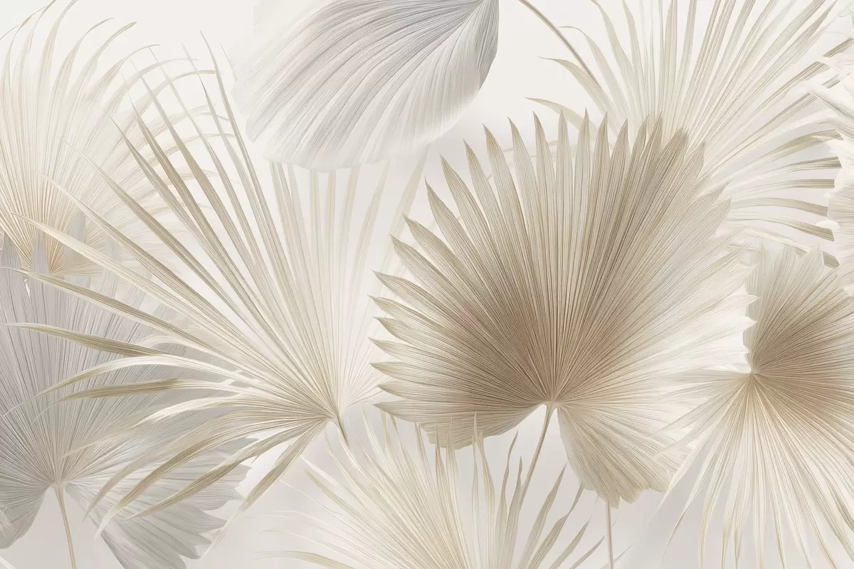 Тапете за зид Мекане лепезе од тропског лишћа у светло беж и плавкастим тоновима бр. w09084