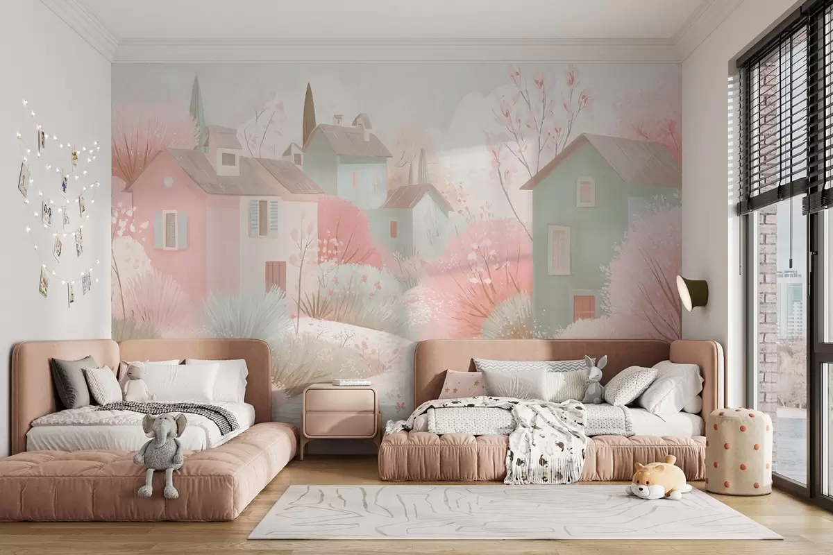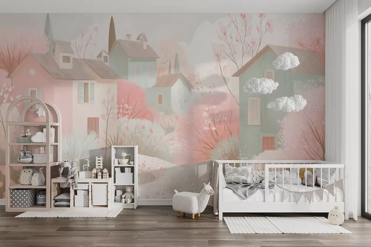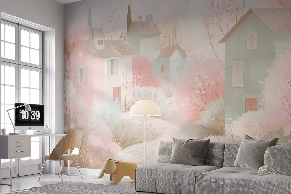 Тапете за зид Град из бајке у стилу уљаних слика у ружичастим нијансама бр. w09095