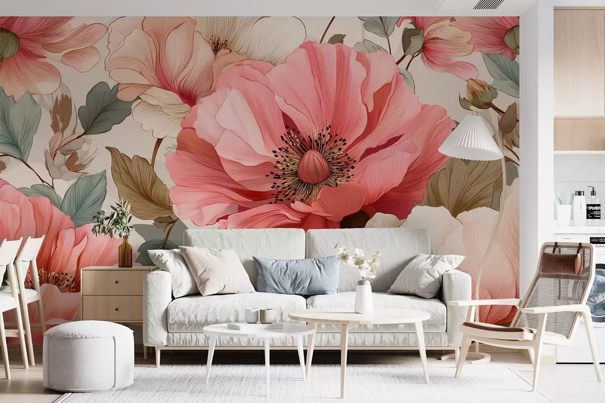 Тапете за зид Нежни макови са листовима у црвено-ружичастим нијансама бр. w09100