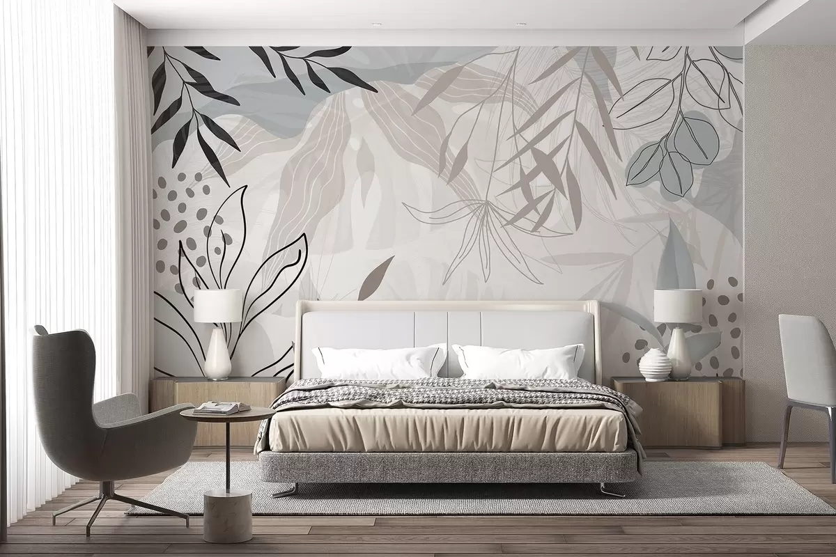 Тапете за зид Апстрактни цветни модерни дизајн са пастелно беж, сивим, плавим и црним листовима, нежном линијском уметношћу и меком позадином бр. w09105