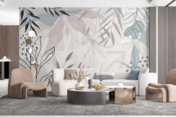 Тапете за зид Апстрактни цветни модерни дизајн са пастелно беж, сивим, плавим и црним листовима, нежном линијском уметношћу и меком позадином бр. w09105