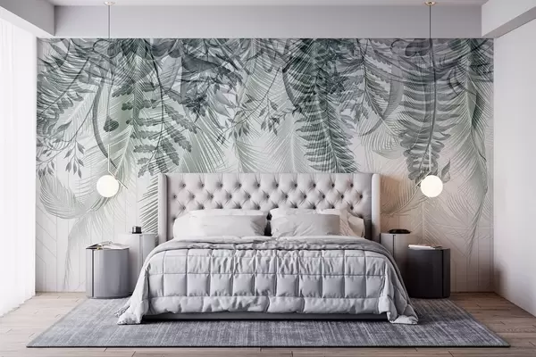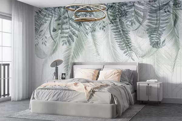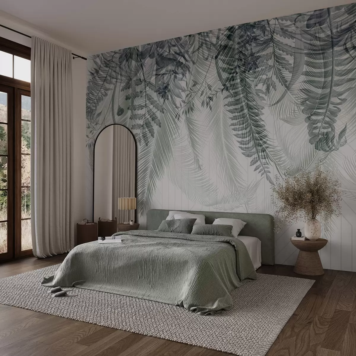 Тапете за зид Нежно падајуће тропско лишће папрати и палми, геометријска позадина, меко светло, пригушене боје, елегантно бр. w09106