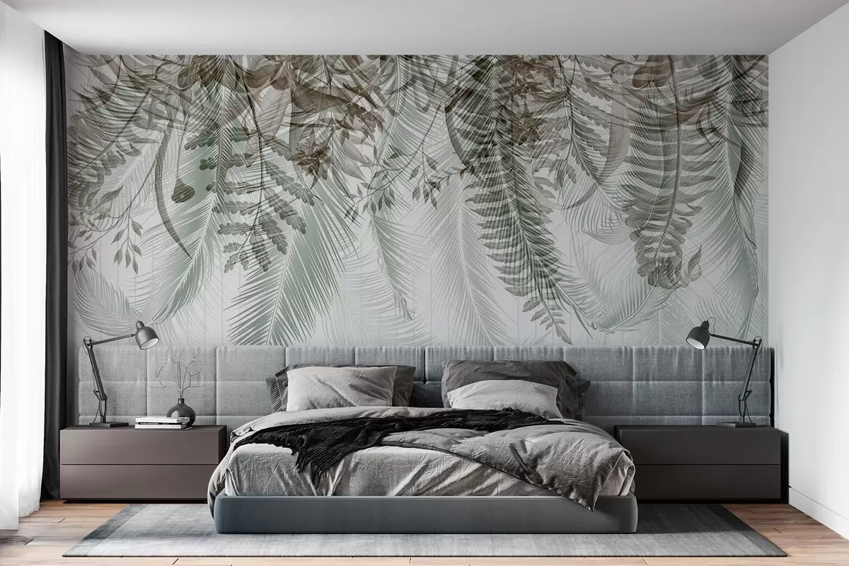 Тапете за зид Нежно падајуће тропско лишће папрати и палми, геометријска позадина, меко светло, пригушене боје, елегантно бр. w09106v1