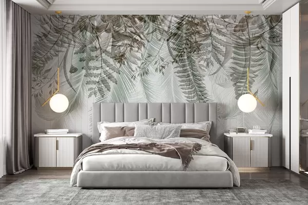 Тапете за зид Нежно падајуће тропско лишће папрати и палми, геометријска позадина, меко светло, пригушене боје, елегантно бр. w09106v1