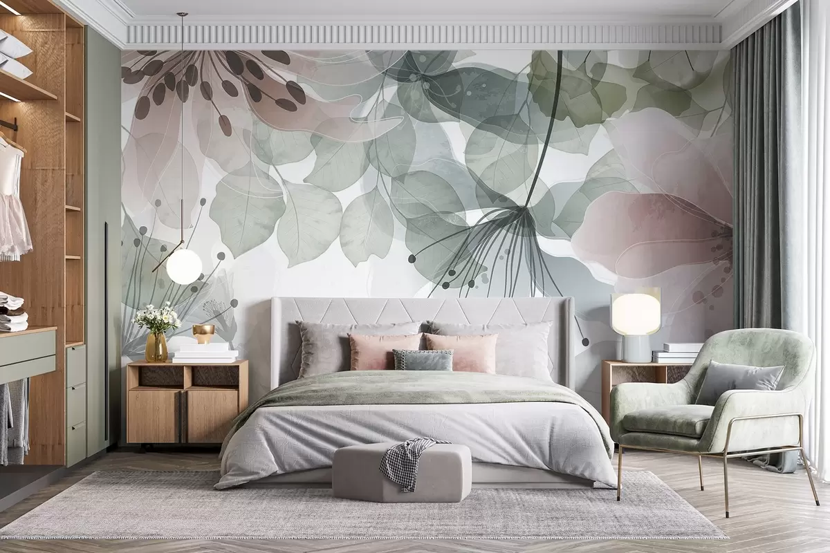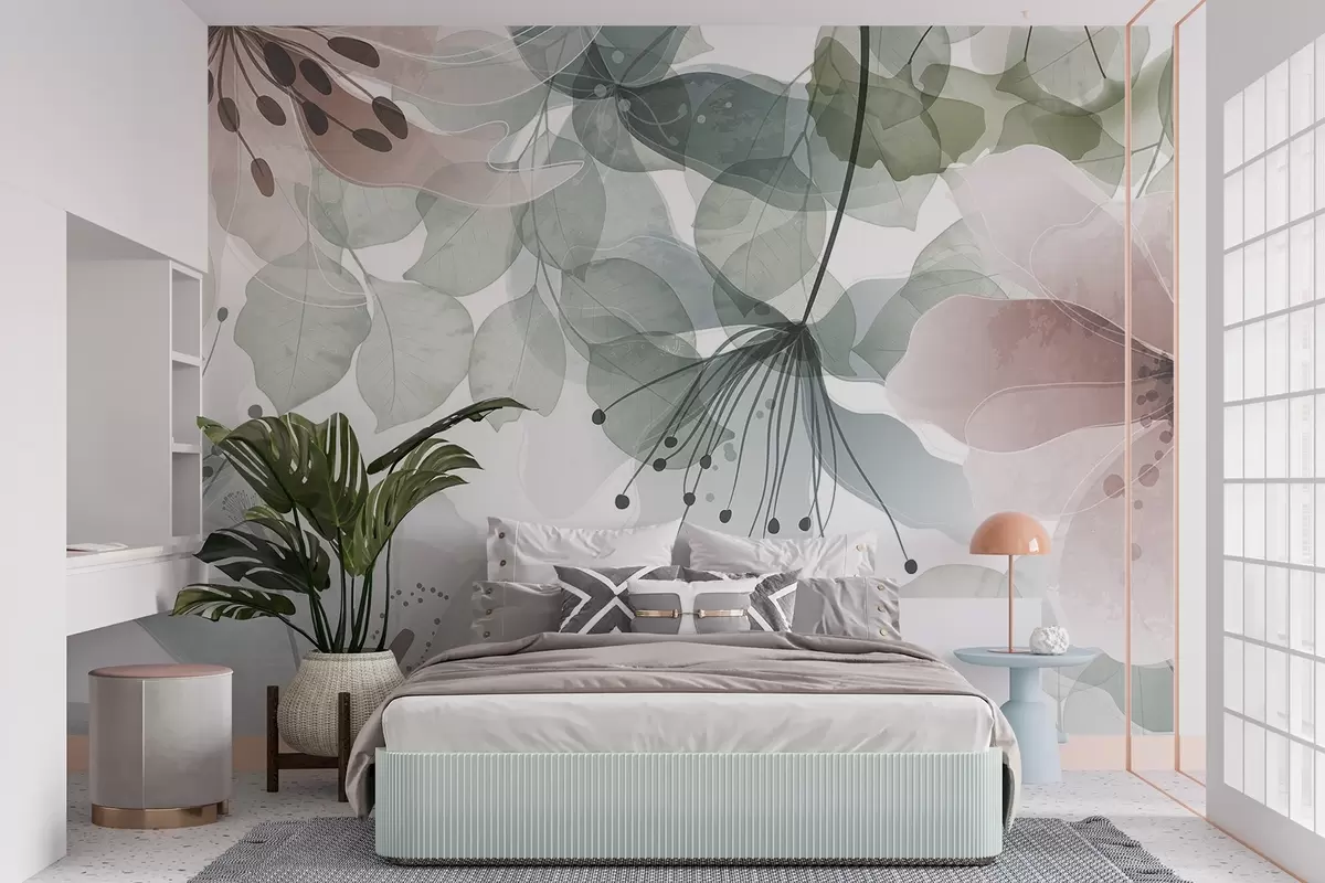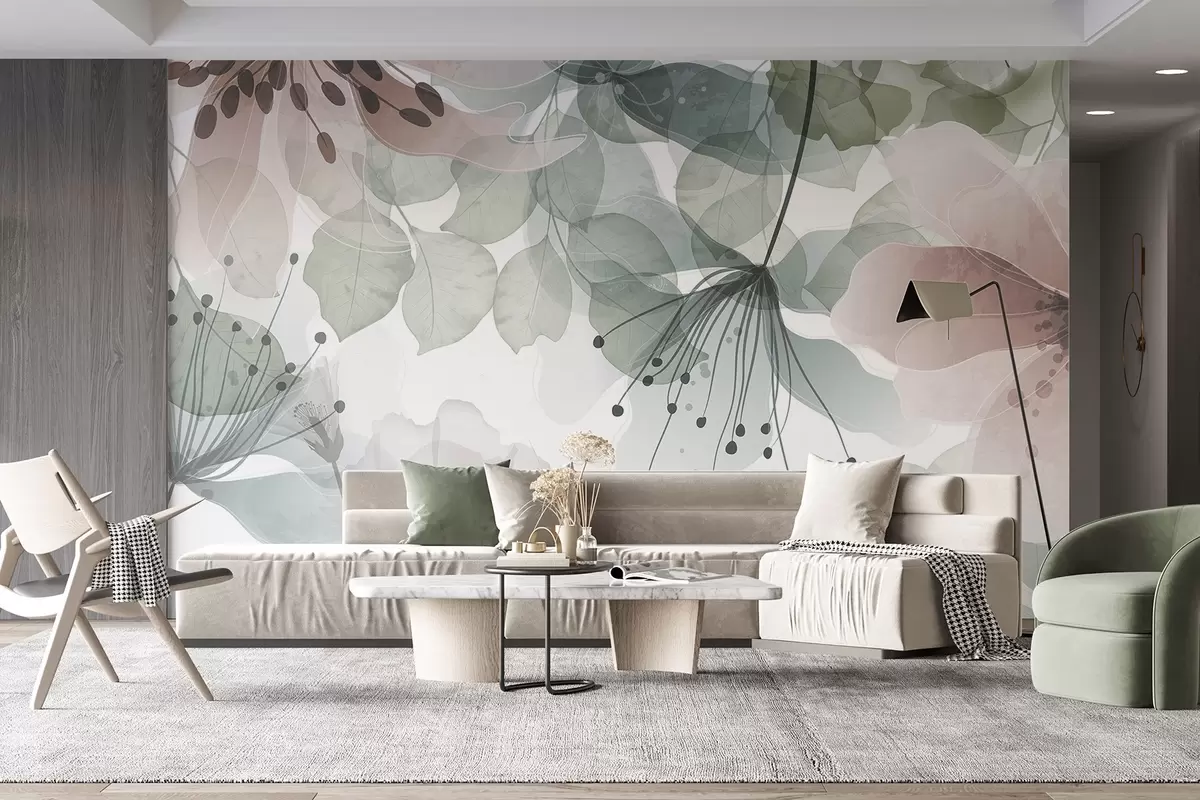 Тапете за зид Цвеће и лишће у пастелним бојама, провидне латице и лишће, меки акварелни ефекат, нежне линије, бела позадина бр. w09107