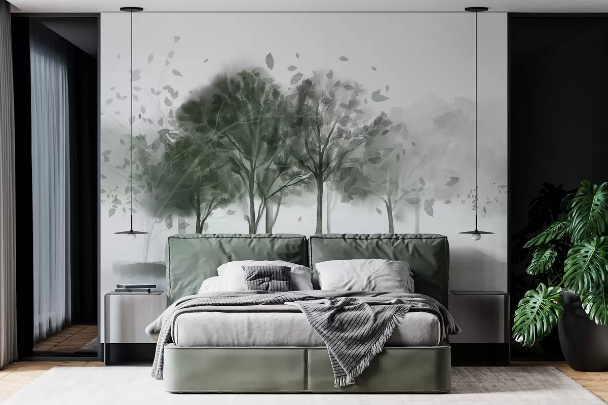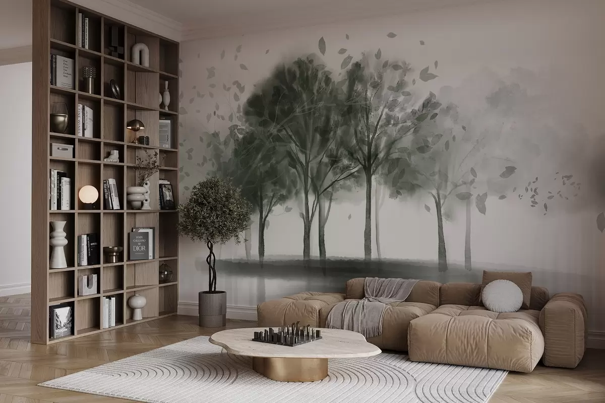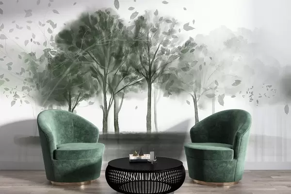Тапете за зид Апстрактни пејзаж са дрвећем са зеленим лишћем које се огледа у води, у стилу акварела текстуре бр. w09109