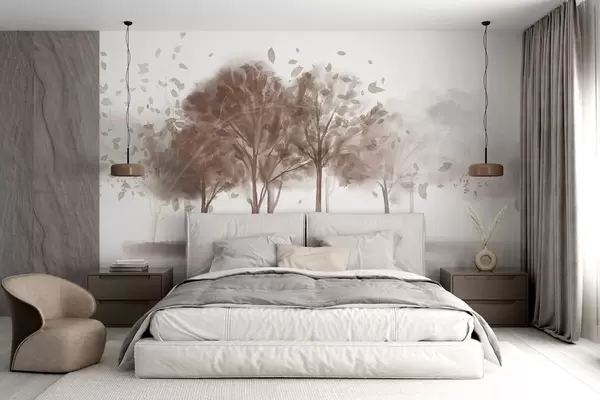 Тапете за зид Апстрактни пејзаж са дрвећем са смеђим лишћем које се огледа у води, у стилу акварела текстуре бр. w09109v1