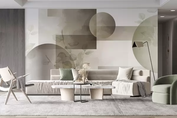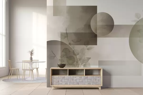 Тапете за зид Апстрактни модерни минималистички геометријски дизајн са круговима и правоугаоницима, листовима еукалиптуса, ефектом акварела бр. w09110v1