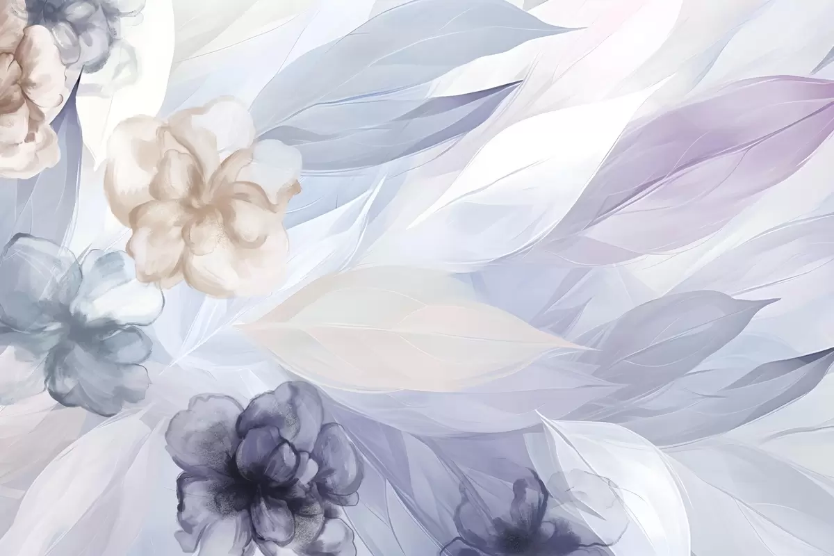 Тапете за зид Нежно цвеће и листови у нијансама беле, плаве, љубичасте и беж цветне позадине, меке боје, нежне латице бр. w09111