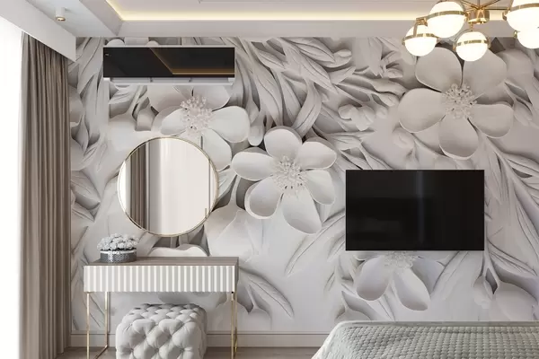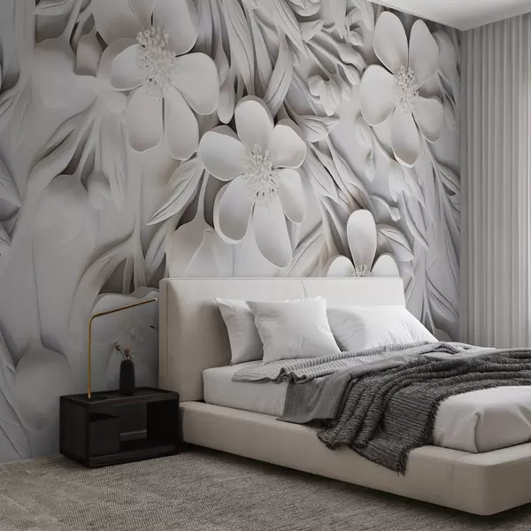 wall murals Бело цвеће и лишће на белој позадини, елегантан цветни, декоративни дизајн, замршени детаљи w09113