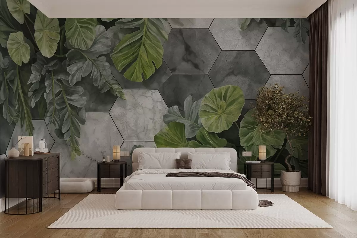 Тапете за зид Зелено тропско лишће и биљке на позадини сивих и белих текстурираних плочица, бујно лишће модерног дизајна бр. w09117
