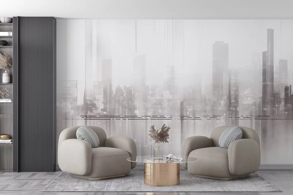 Тапете за зид Апстрактни текстурирани градски пејзаж са високим зградама и тракама, у нијансама сиве и беле, стварајући магловит ефекат бр. w09119