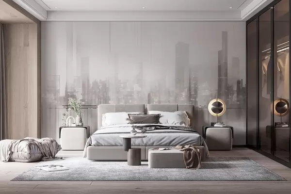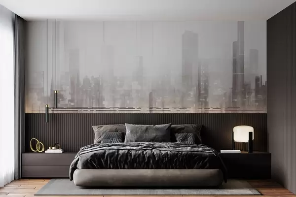 Тапете за зид Апстрактни текстурирани градски пејзаж са високим зградама и тракама, у нијансама сиве и беле, стварајући магловит ефекат бр. w09119