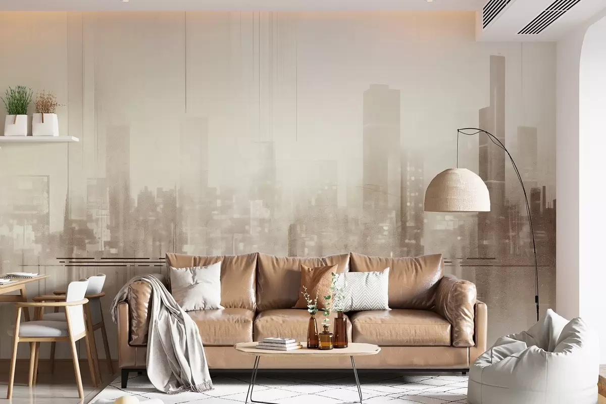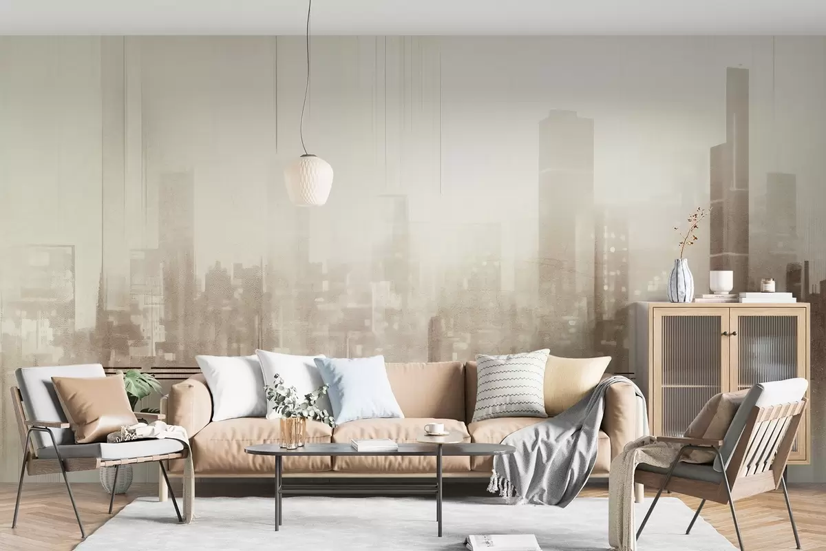 Тапете за зид Апстрактни текстурирани градски пејзаж са високим зградама и тракама, у нијансама беж и беле, стварајући магловити ефекат бр. w09119v1