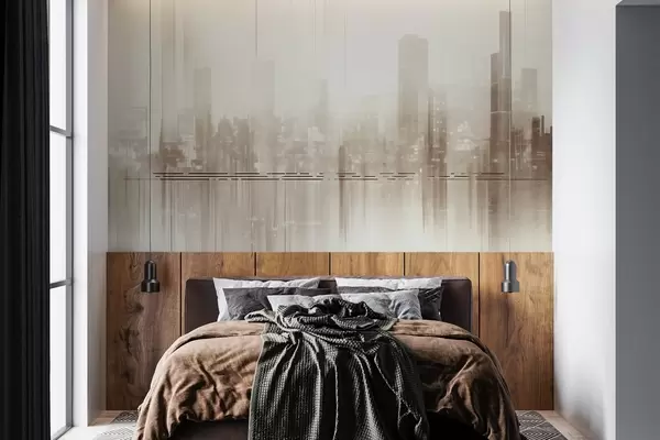 Тапете за зид Апстрактни текстурирани градски пејзаж са високим зградама и тракама, у нијансама беж и беле, стварајући магловити ефекат бр. w09119v1