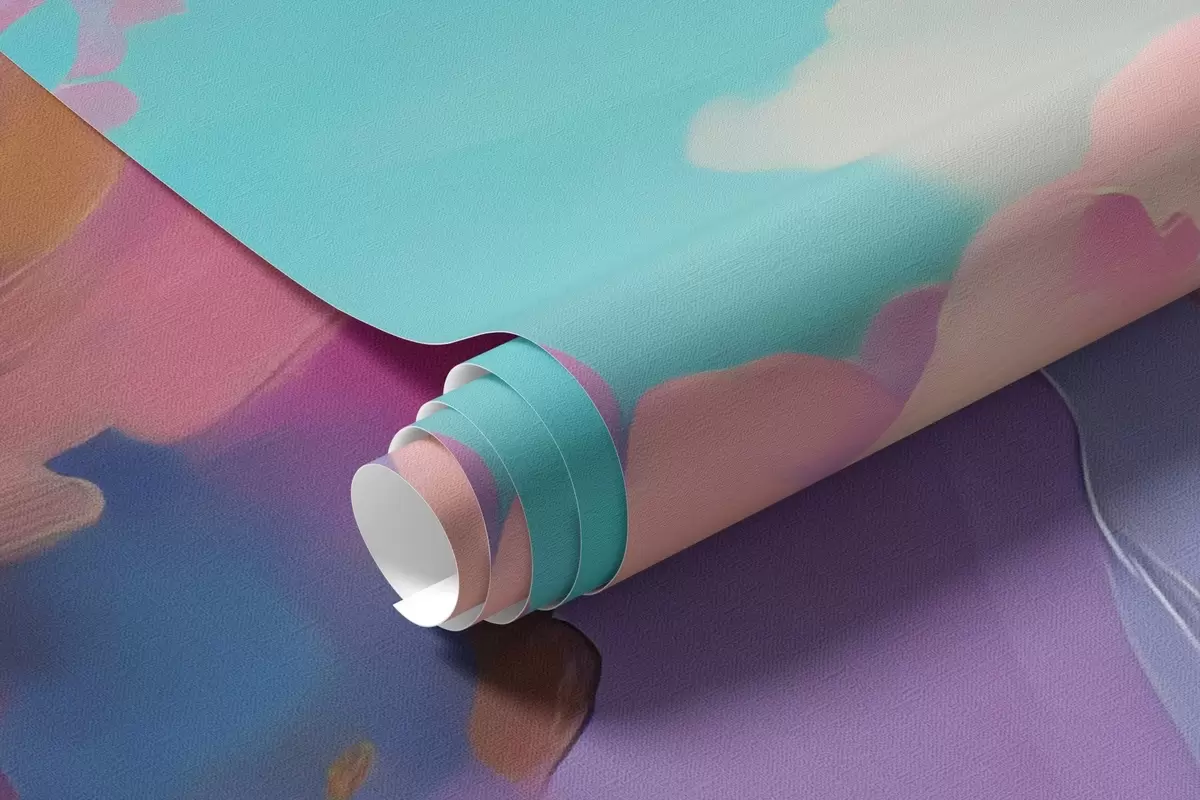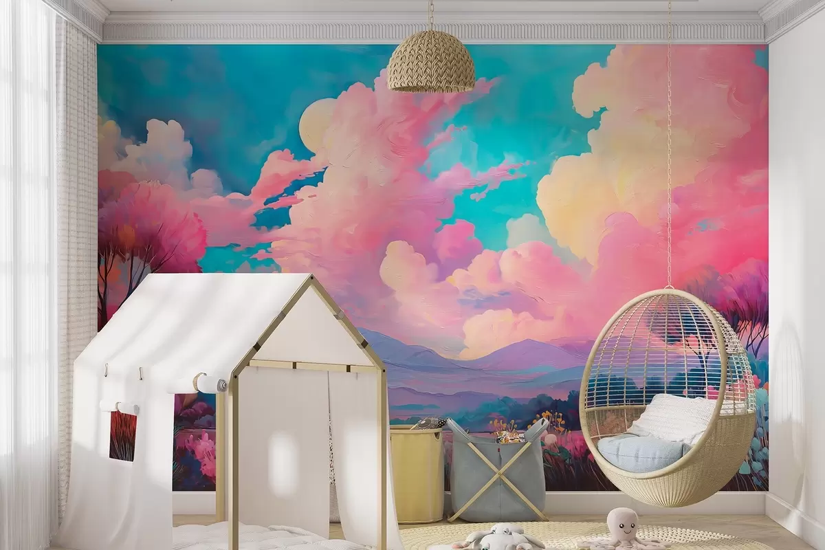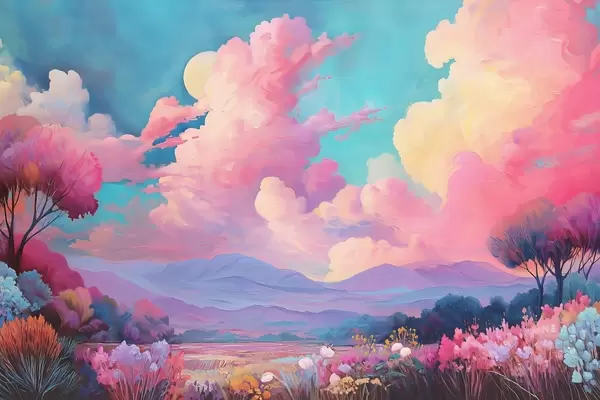 Тапете за зид Шарени пејзаж у стилу уљаног сликарства са ружичастим небом, биљкама и дрвећем бр. w09123