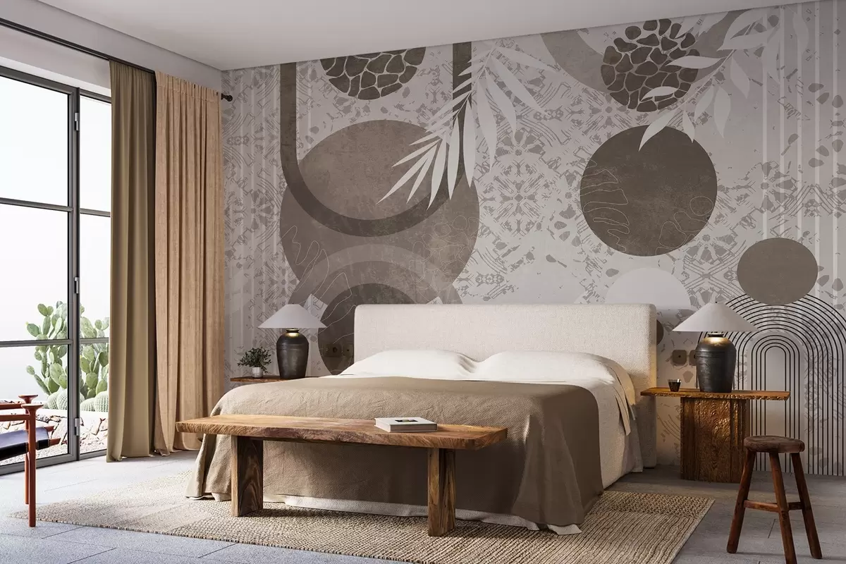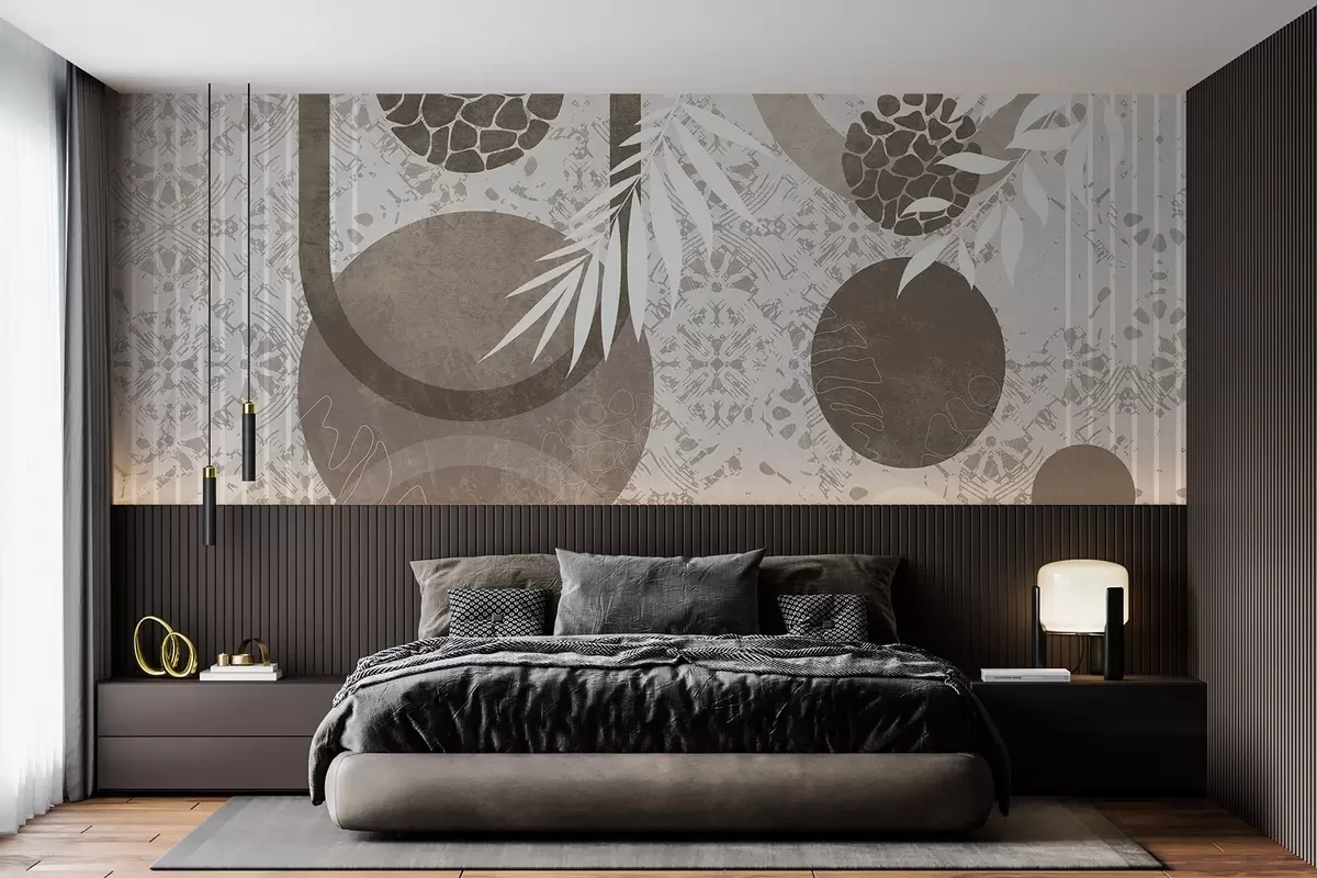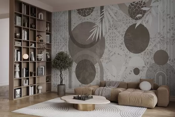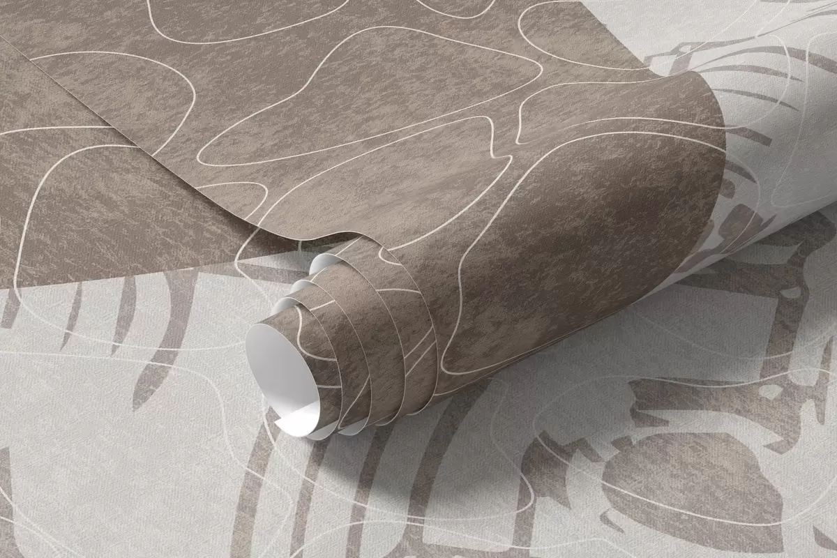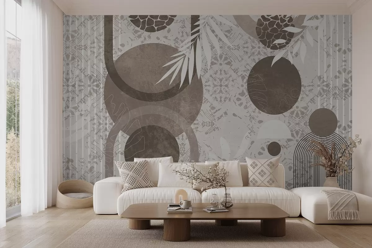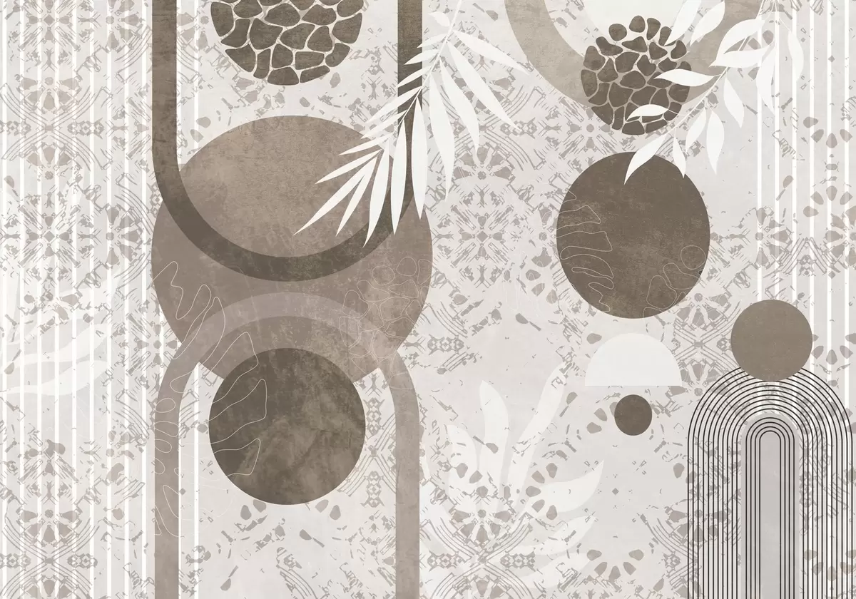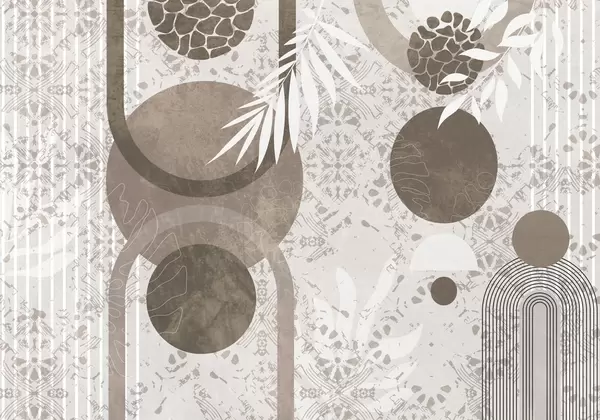Тапете за зид Апстрактни текстурни геометријски облици у смеђој и белој боји, кругови, лукови и ботанички елементи, модеран и минималистички дизајн бр. w09130