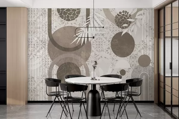 Тапете за зид Апстрактни текстурни геометријски облици у смеђој и белој боји, кругови, лукови и ботанички елементи, модеран и минималистички дизајн бр. w09130