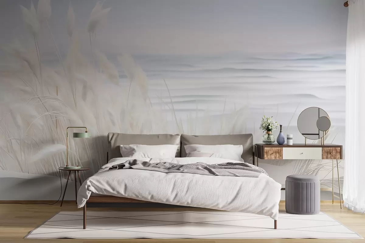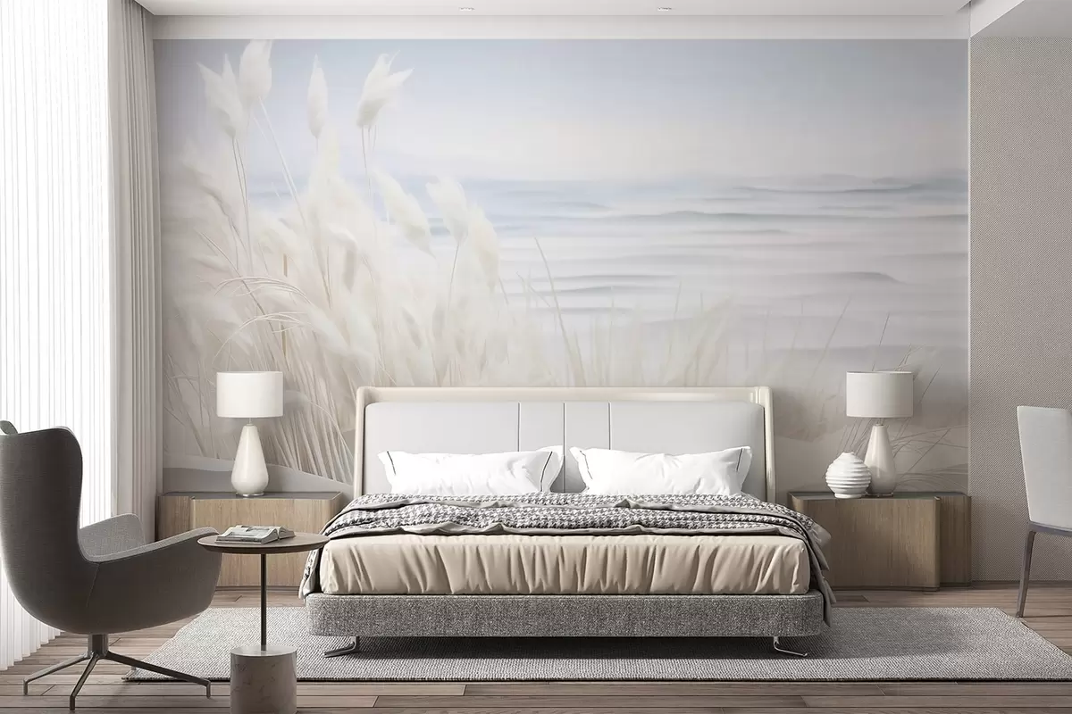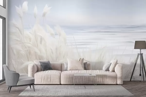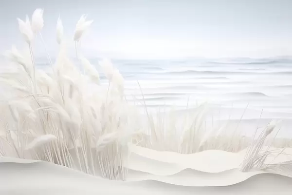 Тапете за зид Пејзаж са белом пампас травом на пешчаној дини, са светлоплавим океаном у позадини, меки, минималистички стил бр. w09132