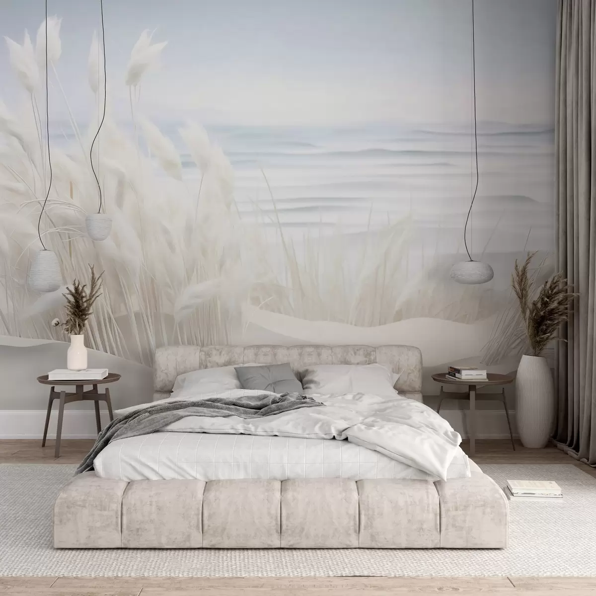 Тапете за зид Пејзаж са белом пампас травом на пешчаној дини, са светлоплавим океаном у позадини, меки, минималистички стил бр. w09132