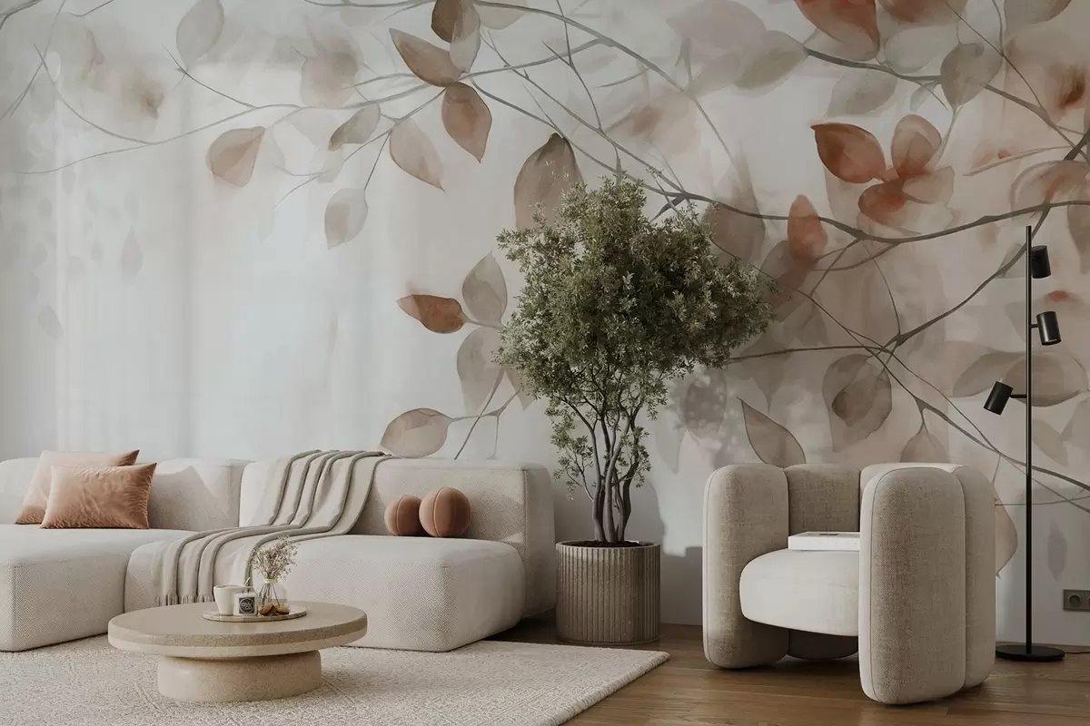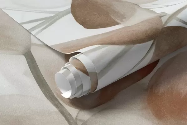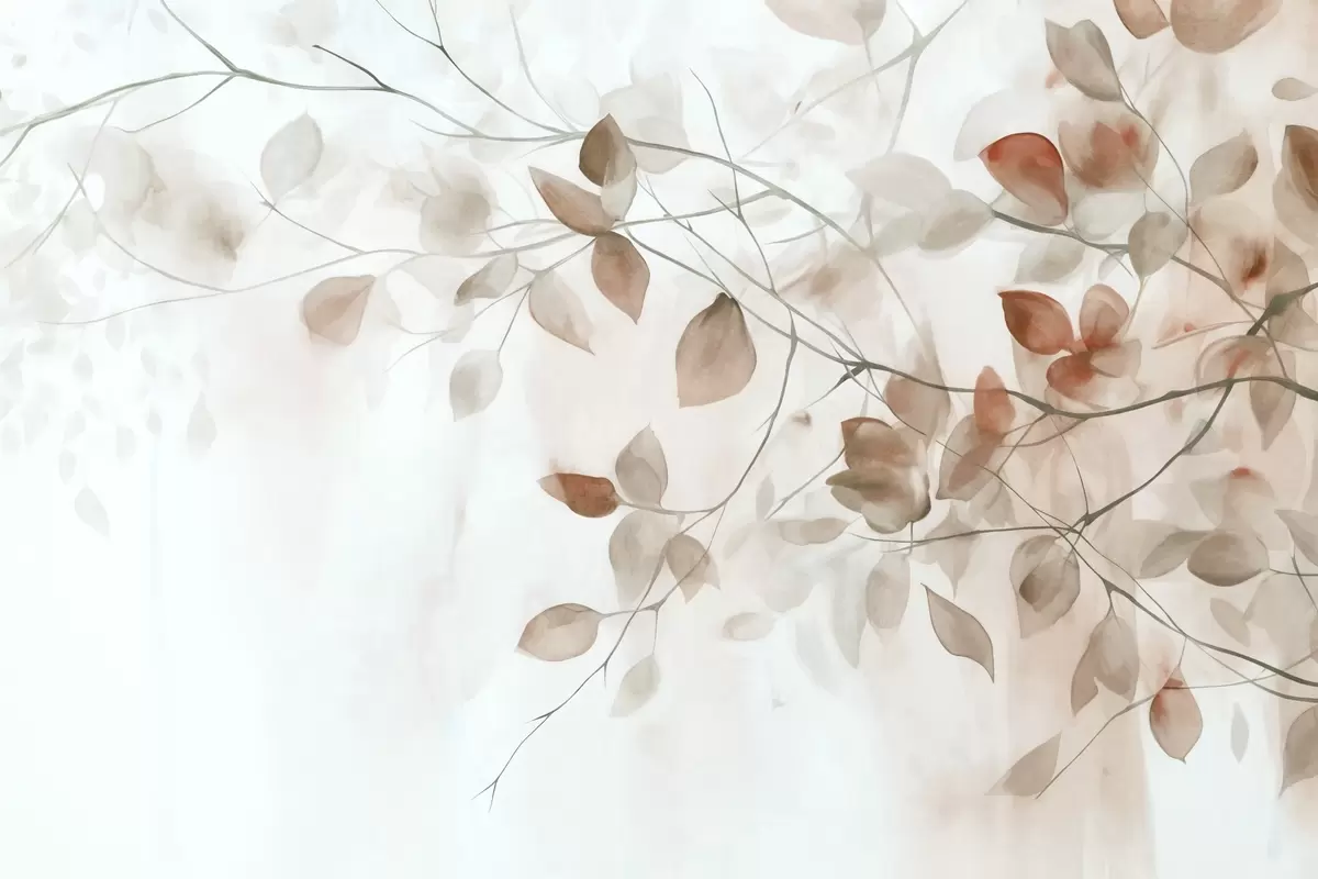 Тапете за зид Текстурна акварелна имитација смеђег лишћа и грана, меке боје, нежни детаљи на белој позадини бр. w09133