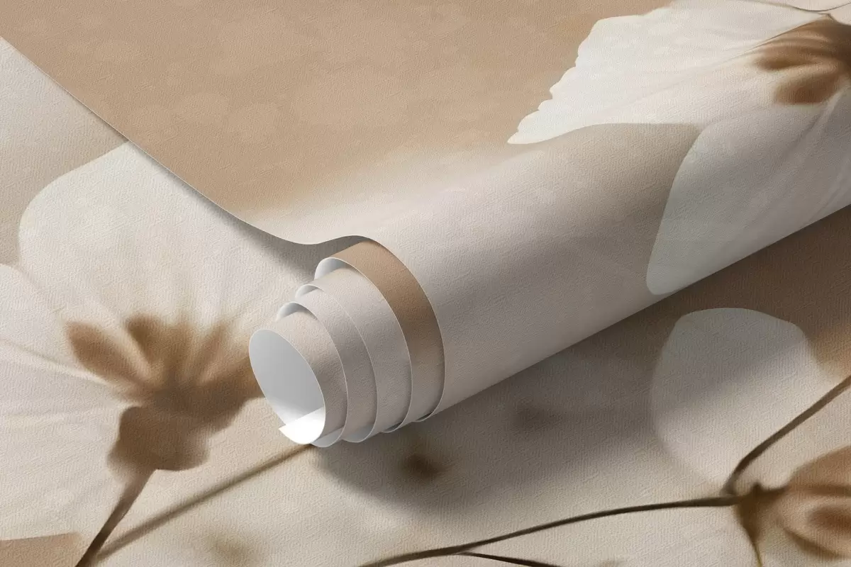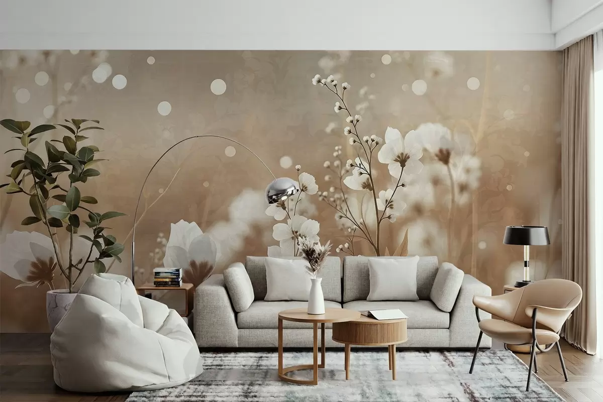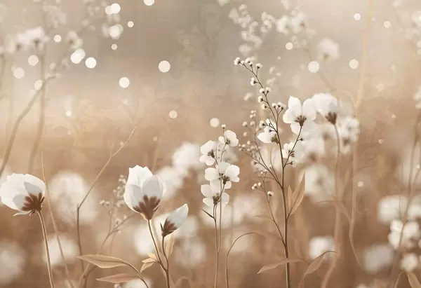 Тапете за зид Бело цвеће са смеђим стабљикама и листовима у пољу, ефекат бокеха, топла палета боја, елегантно уметничко дело инспирисано природом бр. w09135