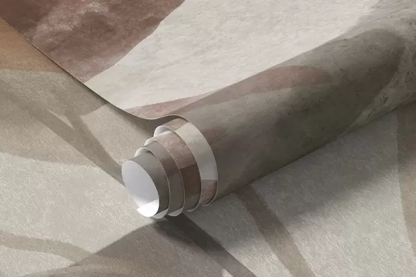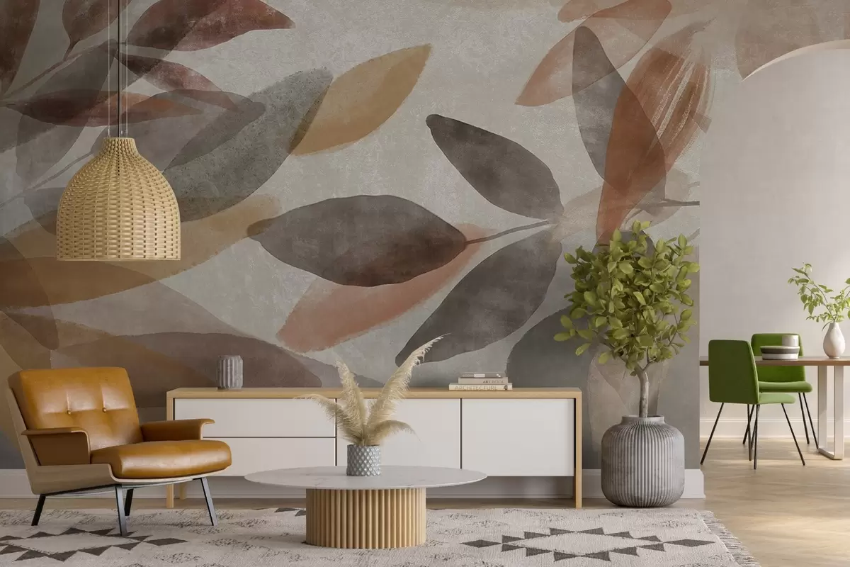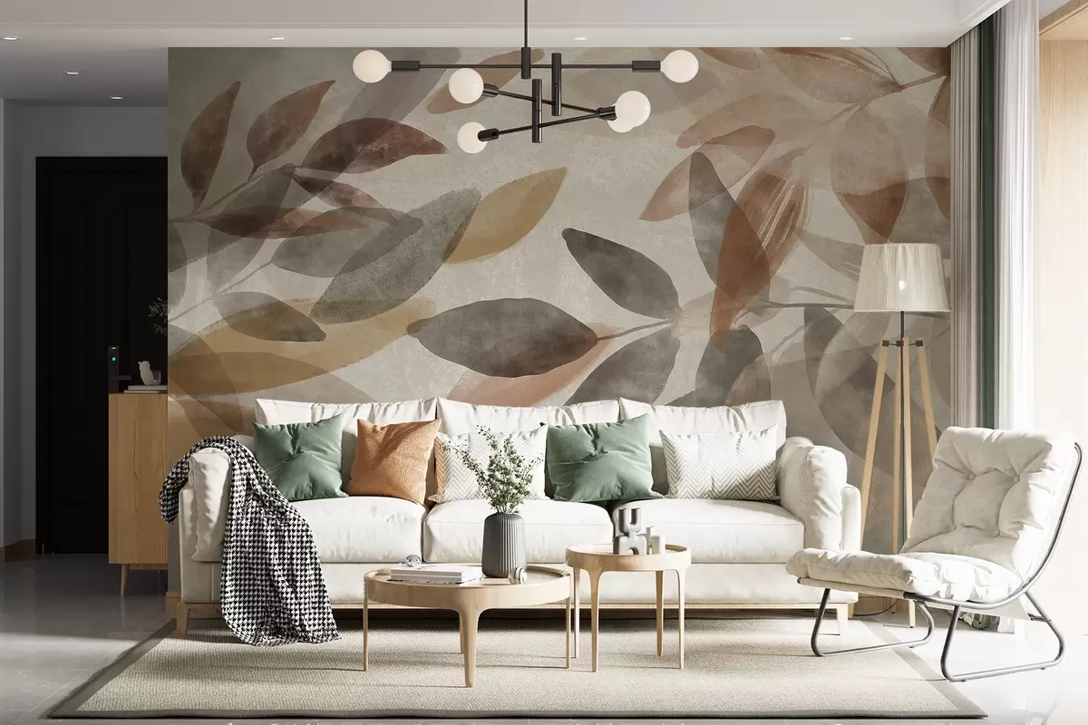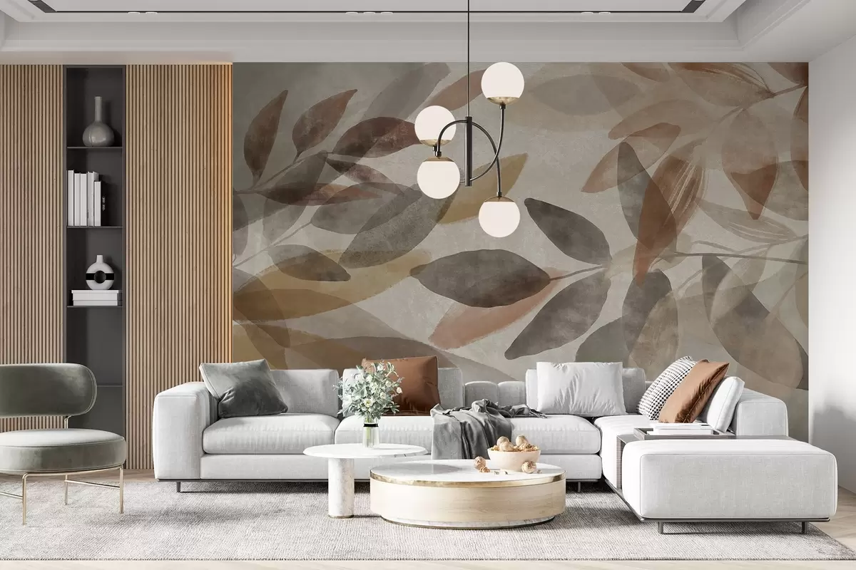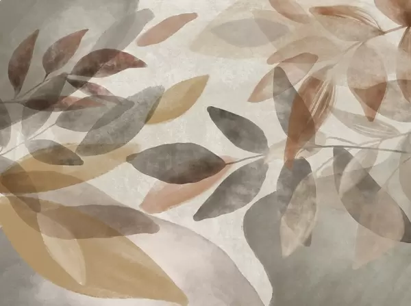 Тапете за зид Апстрактно текстурирано лишће у пригушеним смеђим, беж и сивим тоновима, провидни облици, минималистички стил, органски облици бр. w09140