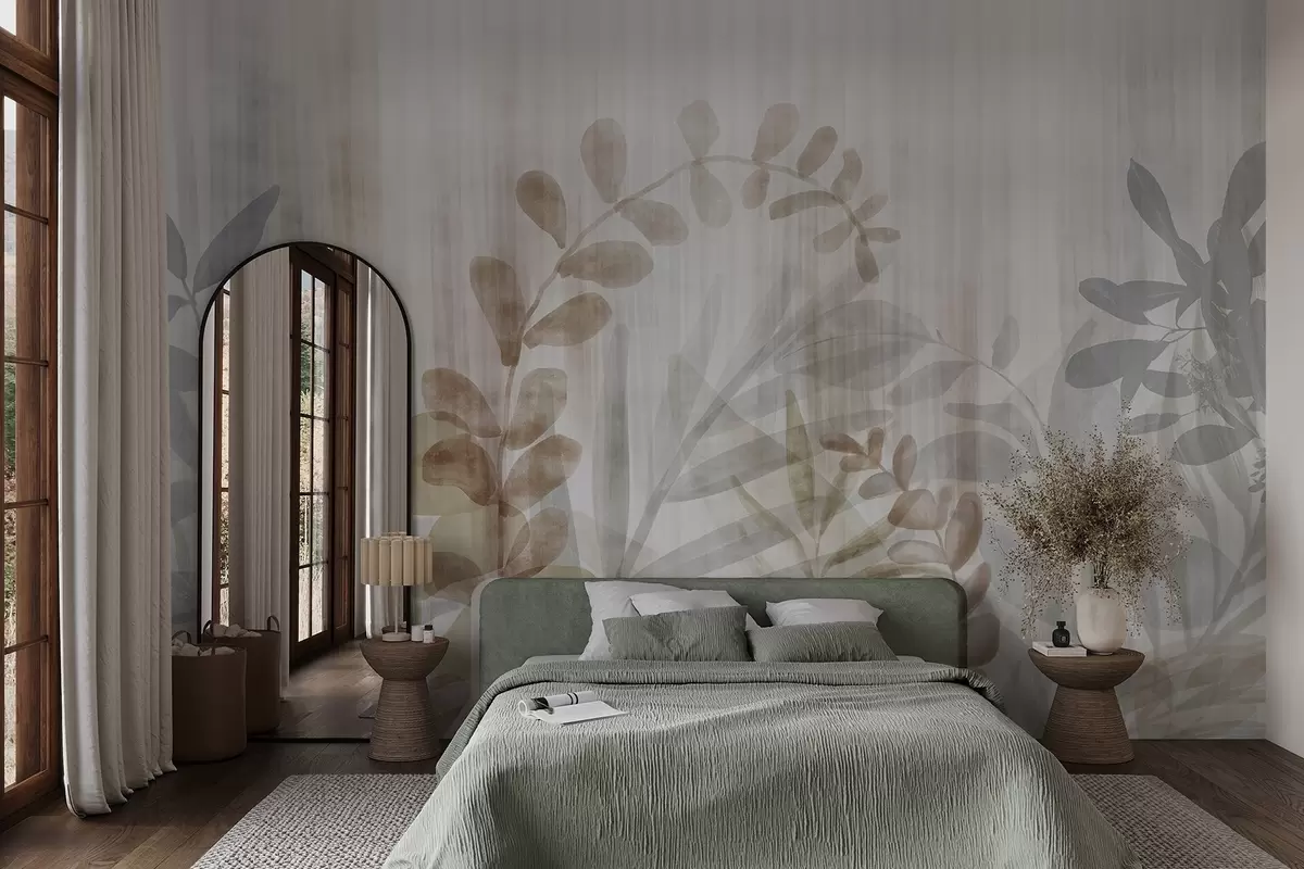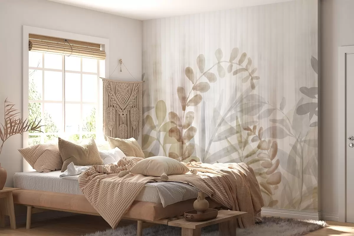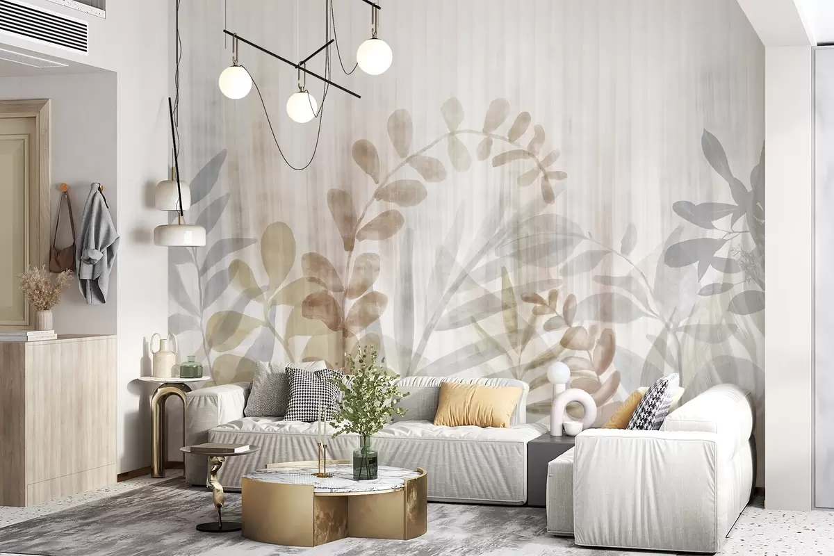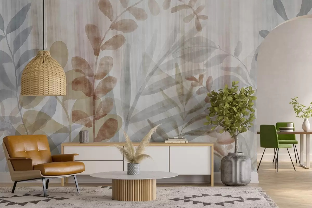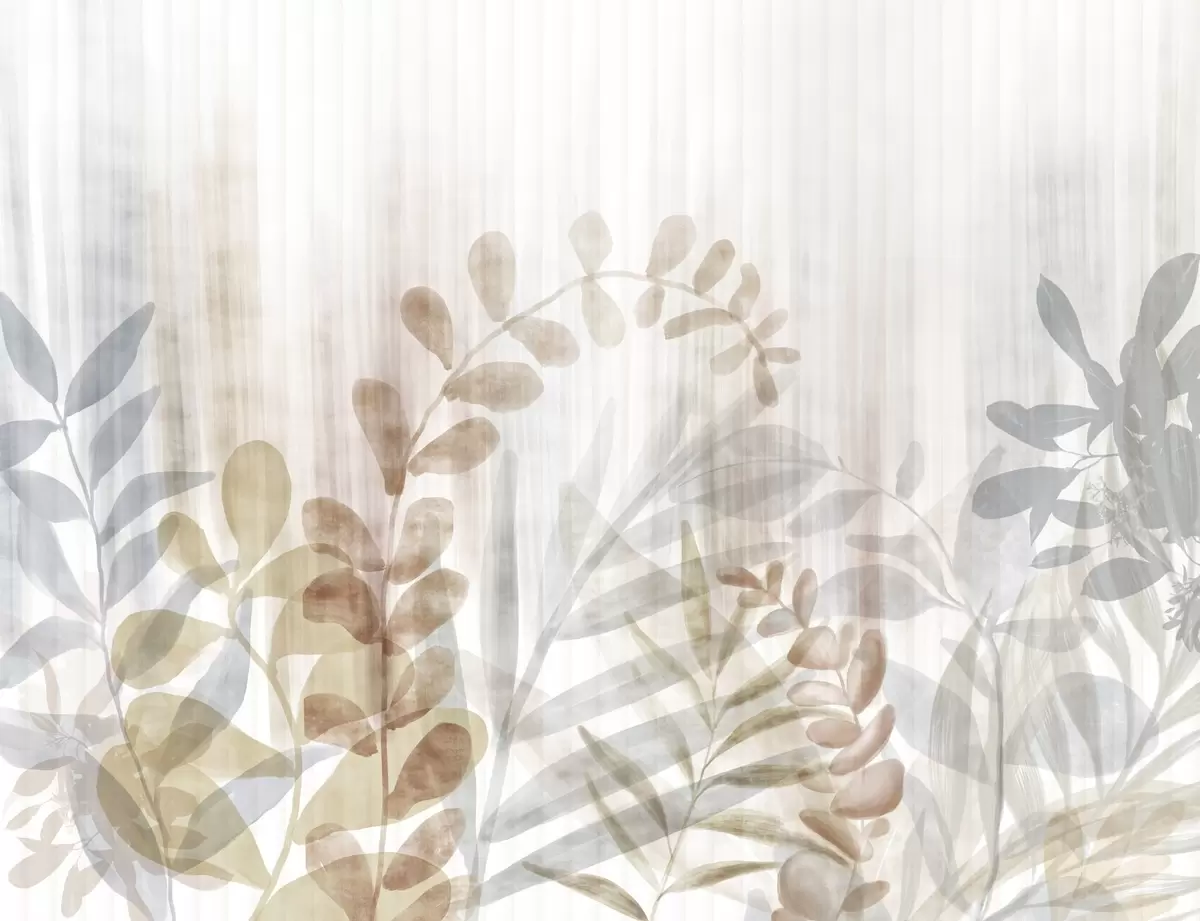 Тапете за зид Имитација биљака акварелом са вишебојним пригушеним листовима, светла позадина са вертикалним линијама, ботаничка илустрација бр. w09146