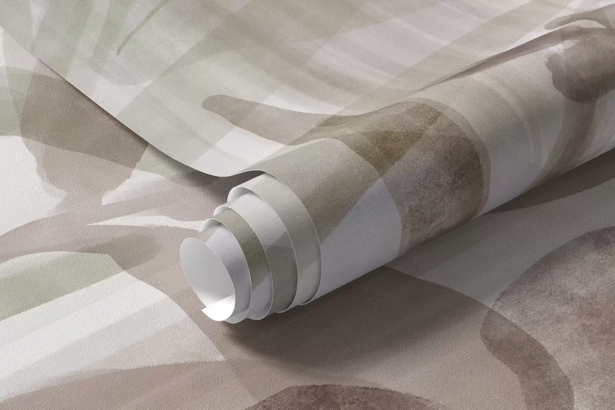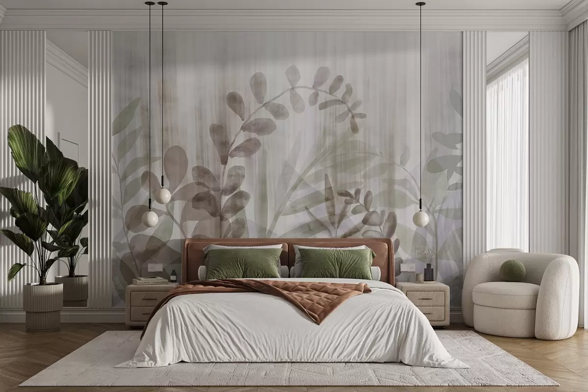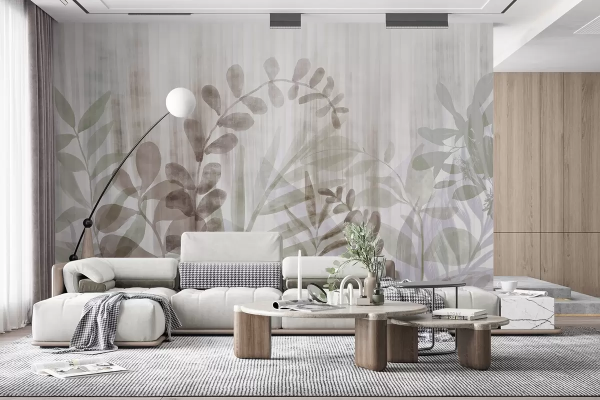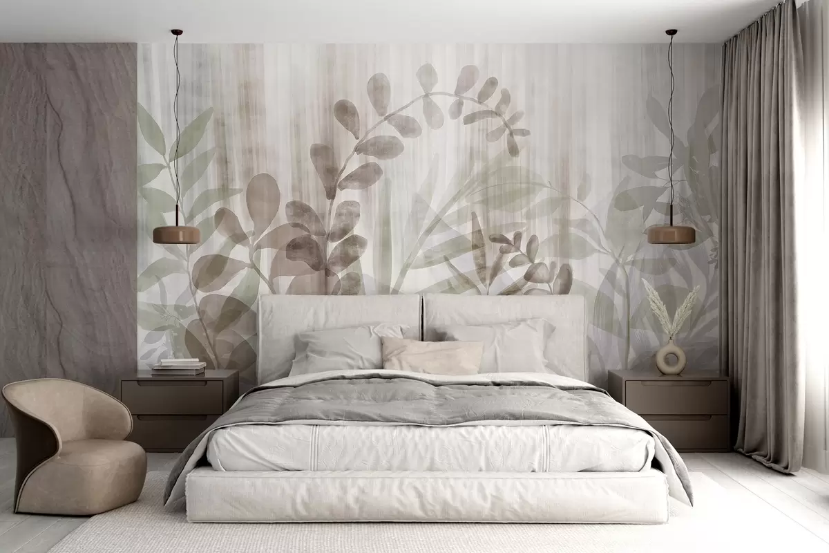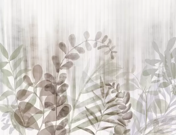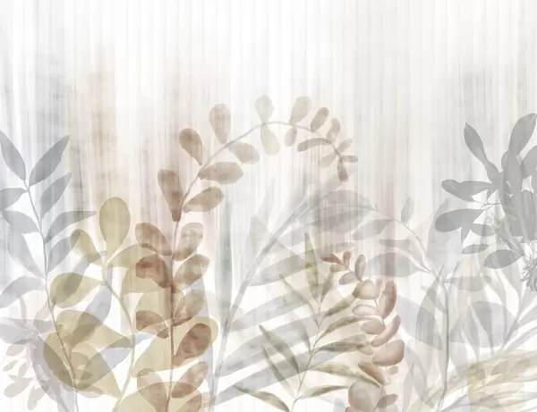 Тапете за зид Имитација биљака акварелом са вишебојним пригушеним листовима, светла позадина са вертикалним линијама, ботаничка илустрација бр. w09146v1