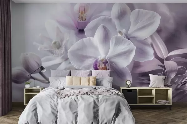 Тапете за зид Бели и јорговани нежни цветови орхидеје, меко осветљење и замућена текстурирана позадина бр. w09155