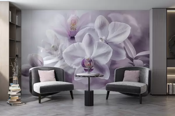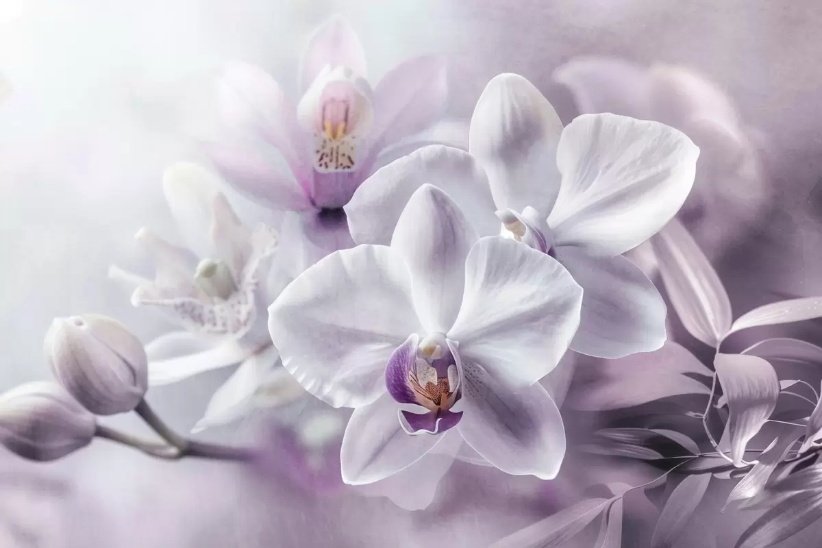 Тапете за зид Бели и јорговани нежни цветови орхидеје, меко осветљење и замућена текстурирана позадина бр. w09155