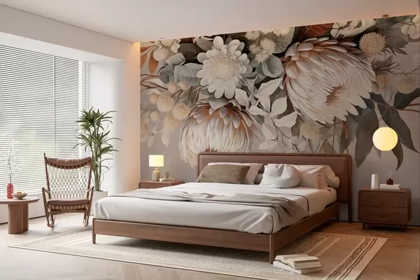 Тапете за зид Велика текстурирана протеа са смеђим акцентима, белим тратинчицама и жутим цветовима, беж пригушена позадина бр. w09157