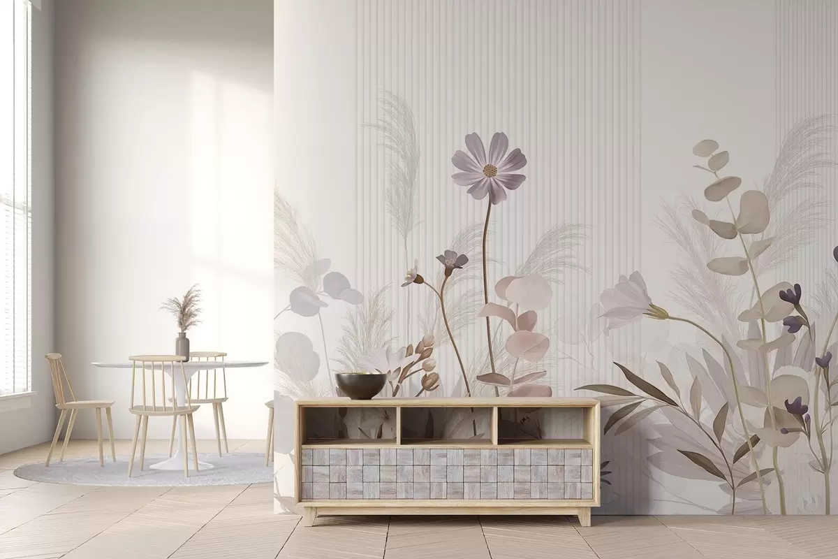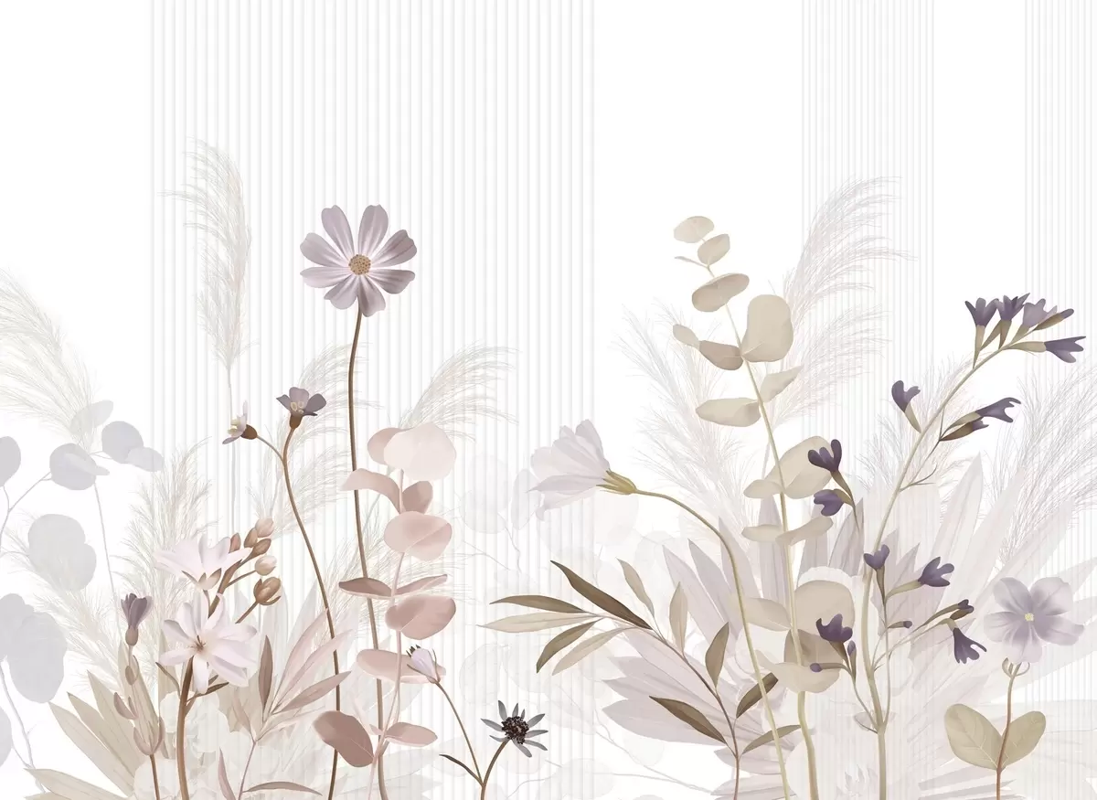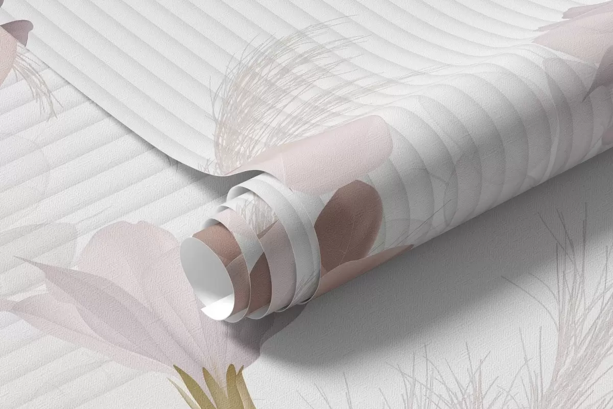 Тапете за зид Цвеће у пастелним бојама, светло смеђе лишће, бела позадина са вертикалним линијама, елегантно и минималистичко бр. w09161